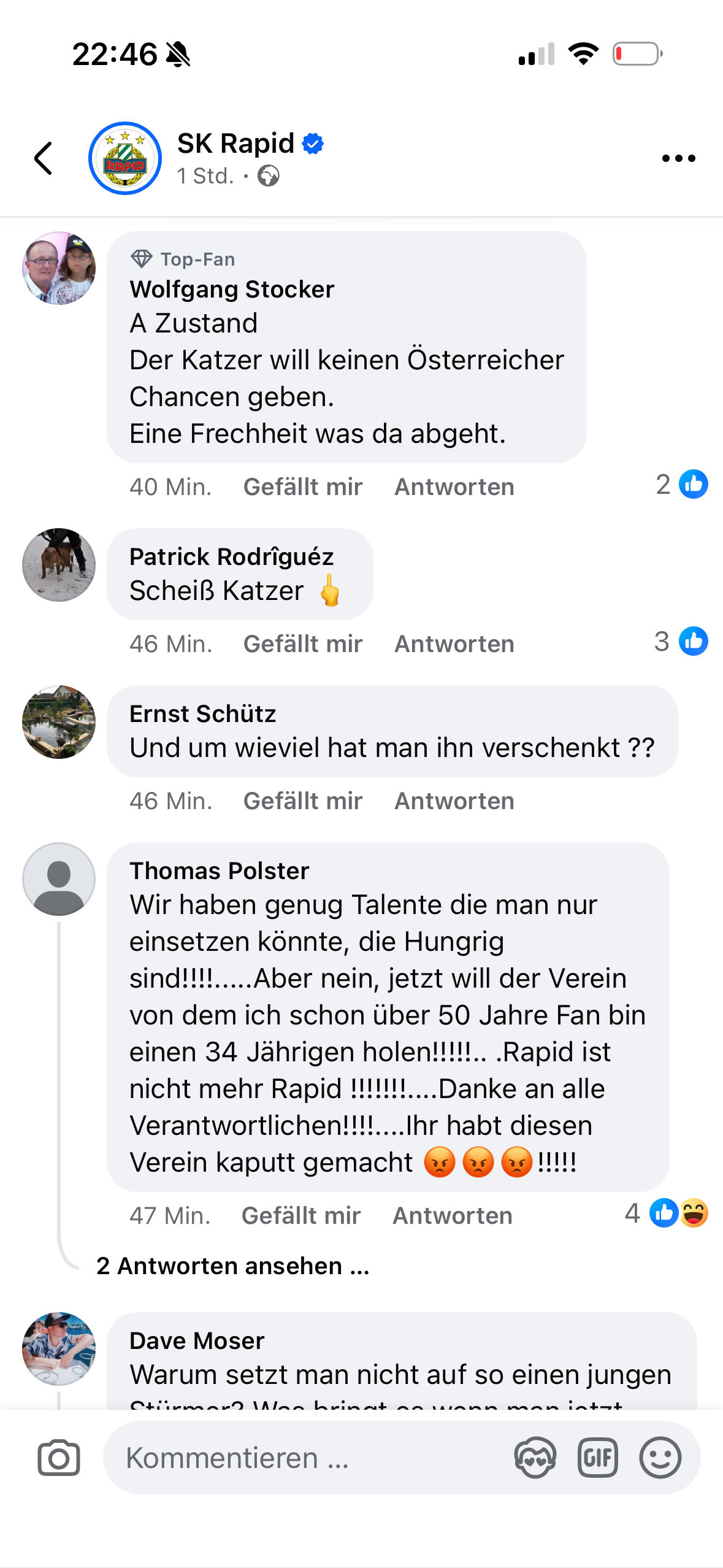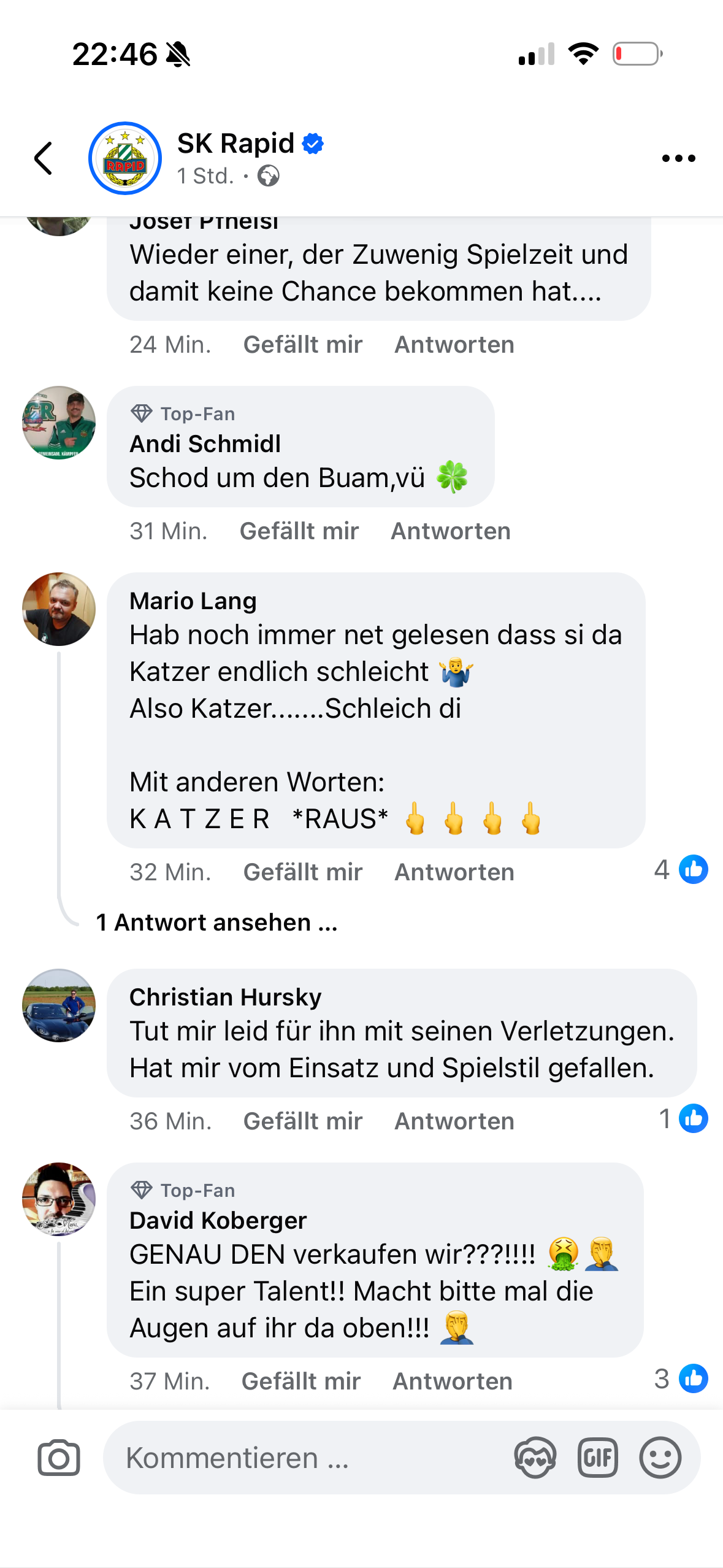 vatertheresa Stammspieler Geschrieben vor 1 Stunde Wollte eigentlich seit dem cup match was zu katzer und seiner bisherigen arbeit sagen aber der user @Tommyboy hat eigentlich fast alle punkte die ich ansprechen wollte abgehakt. Dennoch möcht ich was zur entwicklung hier im asb sagen welche sich besonders im katzer thread gut demonstrieren lässt. Normalerweise geh ich in den rauchenpausen oft meinen facebook feed durch und stoß da natürlich aufgrund meiner bubble auf allerhand fussball news und natürlich vorrangig mit rapid bezug. Dann klickt man den artrikel an und ließt sich die kommentare durch. Egal ob sky, offizieler rapid kanal, fanseiten, laola, 90minuten.at,.. fast immer sind die kommentare voll mit komplett ahnungslosen fernsehfans die die eigenen spieler, mitarbeiter etc. beleidigen und sowieso alles besser wissen und besser machen würden und falls das nicht zutrifft dann spielt sich garantiert ein kleinkrieg zwischen den verschiedenen fanlagern in den kommentaren ab. Ich lese das dann amüsiere mich und denk mir dann wenn ich zuhause bin werd ich ins asb gehen und mir durchlesen was wahre rapidfans von dieser oder jener sache halten und freue mich auf eine diskussion mit leuten die auch im stadion sind und rapid nicht nur aus der zeitung kennen. In letzter zeit und vorallem beim thema katzer trifft das leider aber kaum mehr zu. Facebook und ASB verschmelzen zu einem sumpf kommt mir vor. Was hier manche von sich geben und wie spieler mitarbeiter und vorallem katzer hier beleidigt und respektlos behandelt werden ist weit weg von der art und weise wie ich es von hier gewohnt bin. Als beispiel hier 2 screenshots von facebook. weder hab ich da lange gesucht noch speziell nach katzer bashing sondern einfach auf eine der bischof news geklickt und das hier waren die ersten ca. 10 kommentare. Und da frage ich mich, wollen wir wirklich so sein? Und vl wäre für den ein oder anderen ein rapid pause ganz gut weil manche wirken als würden sie morgen schon mit wut im bauch aufstehen weil katzer immer noch SD ist. 20 Zitieren Diesen Beitrag teilen Link zum Beitrag Auf anderen Seiten teilen More sharing options...