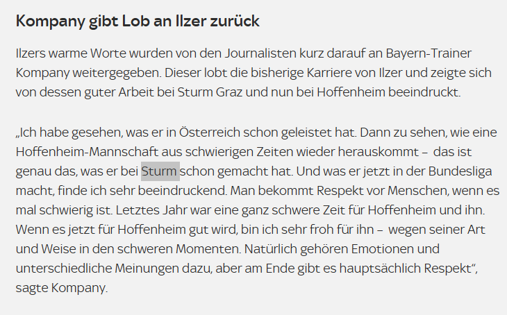 Er meinte glaube ich auch, dass er sich mit Ilzer zu dessen Zeit in Graz vor dem ersten Duell (letzte Saison) mit Hoffenheim beschäftigte, da er zu dem Zeitpunkt in Hoffenheim noch nicht den großen Einfluss hatte und seine Spielidee einprägen konnte. Somit lernte er Ilzers Ideen und Prinzipien über seine vorherige Station Sturm Graz besser kennen, um die Bayern darauf einzustellen.