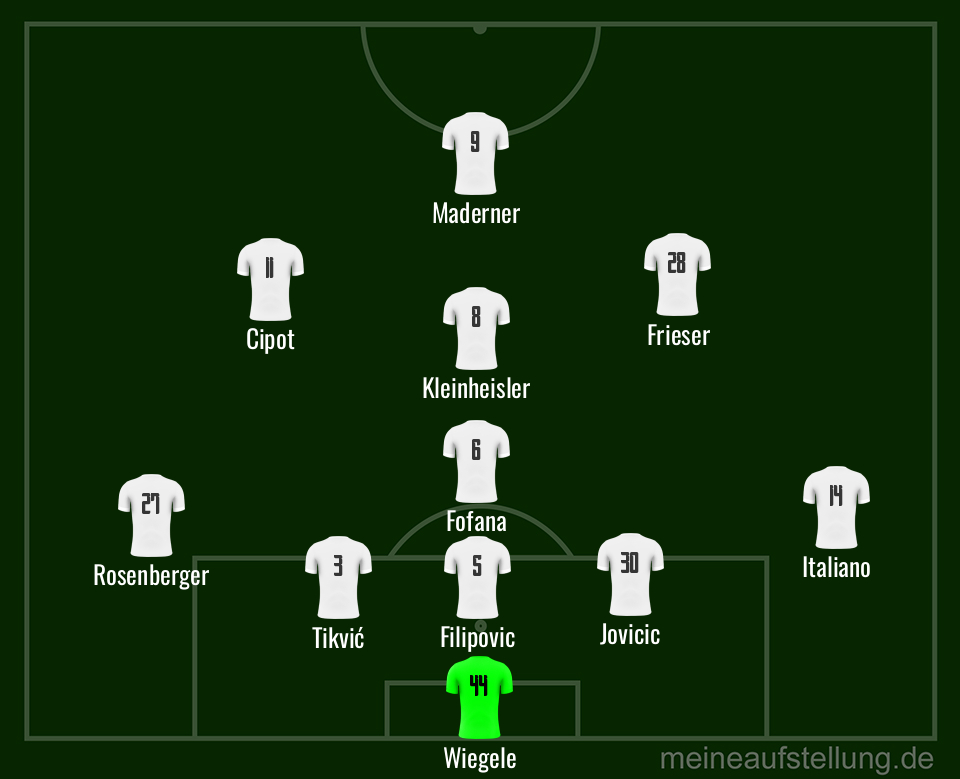 Fofana und Kleinheisler im Mittelfeld, das geht für mich nicht auf. Kleinheisler ist sowieso nicht fit für 90min. Würde eher auf ein 5-2-3 mit Fofana + Schriebl auf 6/8 setzen und Jano oder Lichti statt Frieser bringen.