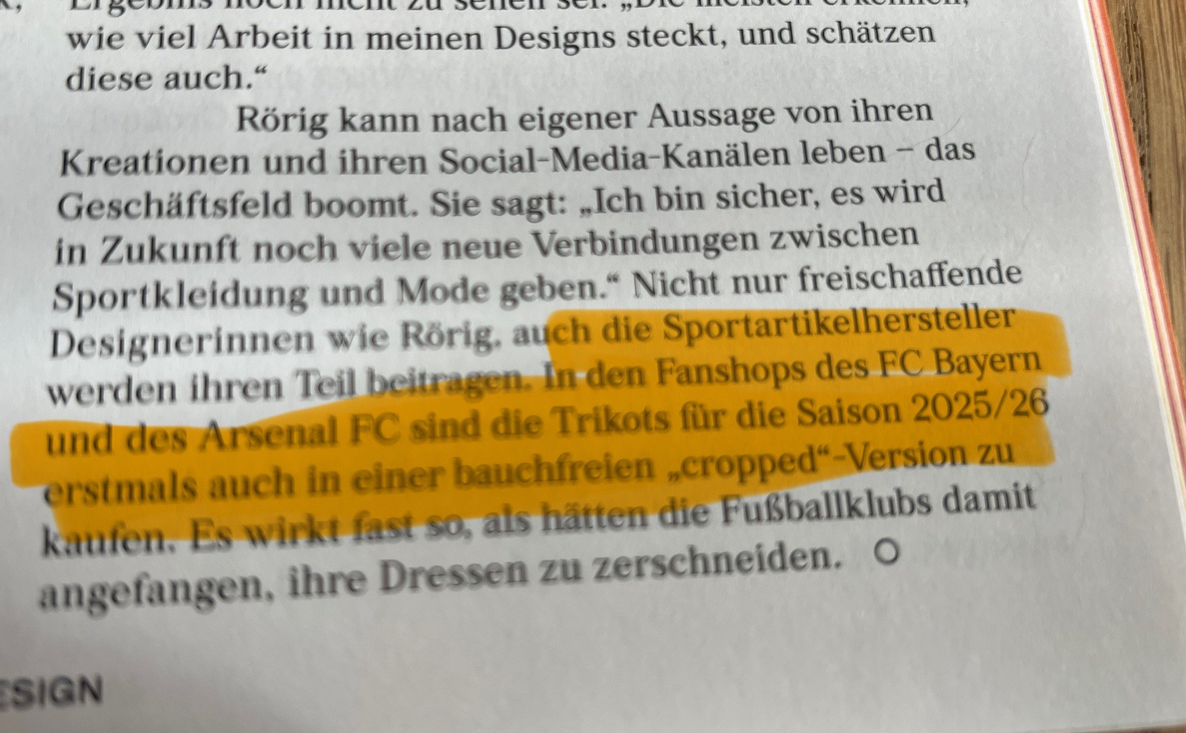Coops ASB-Legende Geschrieben vor 16 Stunden Phisch1981 schrieb vor 2 Stunden: In der aktuelle Ausgabe des Ballesterer (by the way: sehr fragwürdiges Leitthema dieses Mal - FK Gemeinde VTK 🤮) gibt es einen Artikel über die Designerin Fiona Rörig die aus Dressen andere Kleidungsstücke herstellt - offensichtlich ist sie durch TikTok und Co weltweit bekannt damit - sowas geht an mir (zum Glück) vollkommen vorbei… Der Artikel endet damit dass der FC Bayern und Arsenal nun auch schon bauchfreie - man sagt anscheinend cropped dazu - Trikots verkauft 🙈🙈🙈 Frei nach Günther Neukirchner „Des is der nächste depperte Schaß‘ …!“ PS: Trotz Viola Schwerpunkt wieder eine super Ballesterer Ausgabe - Kaufempfehlung 👌 Wo ist das Problem? Es ist ja nicht so als gäbe es nur noch diese Varianten zu kaufen. In südlicheren Ländern ist es Gang und Gäbe, dass Frauen ihre Trikots mit der Schere kürzen - warum soll Adidas nicht gleich Cropped Trikots verkaufen? Von mir aus können die auch eine weitgeschnittene Oversized Version herausbringen. Ist doch leiwand wenn Leute mehr Auswahl haben und Kleidung kaufen können in der sie sich wohlfühlen. 6 Zitieren Diesen Beitrag teilen Link zum Beitrag Auf anderen Seiten teilen More sharing options...