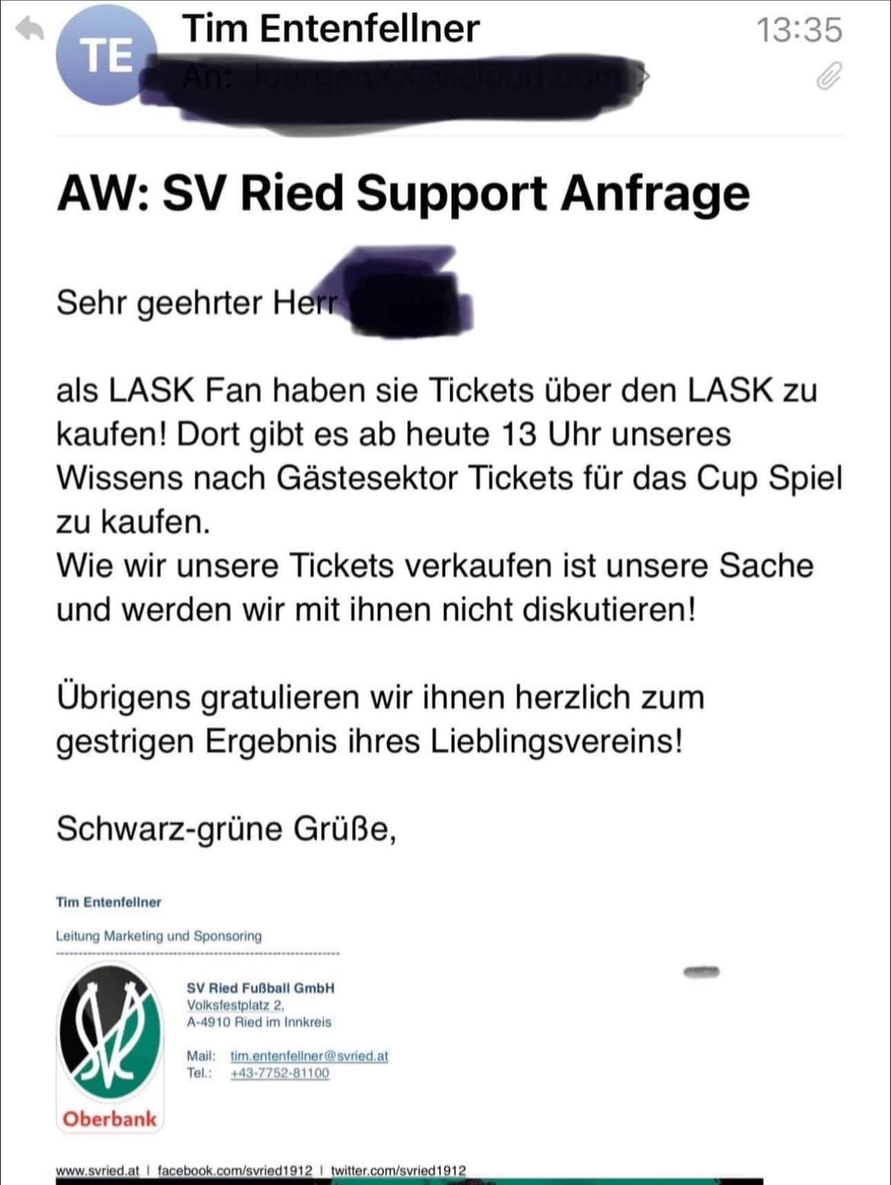 NordBUltra Anfänger Geschrieben vor 8 Stunden mysterio schrieb vor 10 Stunden: Mir ist gerade ein Beitrag auf der Seite „Lask der Stolz von Oö“ untergelaufen wo folgender Screenshot gepostet wurde: Ob das echt ist kann ich nicht sagen. Der Emailverlauf von zuvor wurde nicht gepostet, wer weiß was da vorher gekommen ist seitens des Lask-Anhängers Dennoch ist diese Email als Marketingleiter schon mutig Zumindest wird seitens Verein wenigsten mal versucht die Ticketkäufe der Gäste außerhalb des Gästesektors zu unterbinden. Das war ja bei Rapid und dem ASK zuletzt eine Katastrophe auf den anliegenden Sitzplätzen. 0 Zitieren Diesen Beitrag teilen Link zum Beitrag Auf anderen Seiten teilen More sharing options...