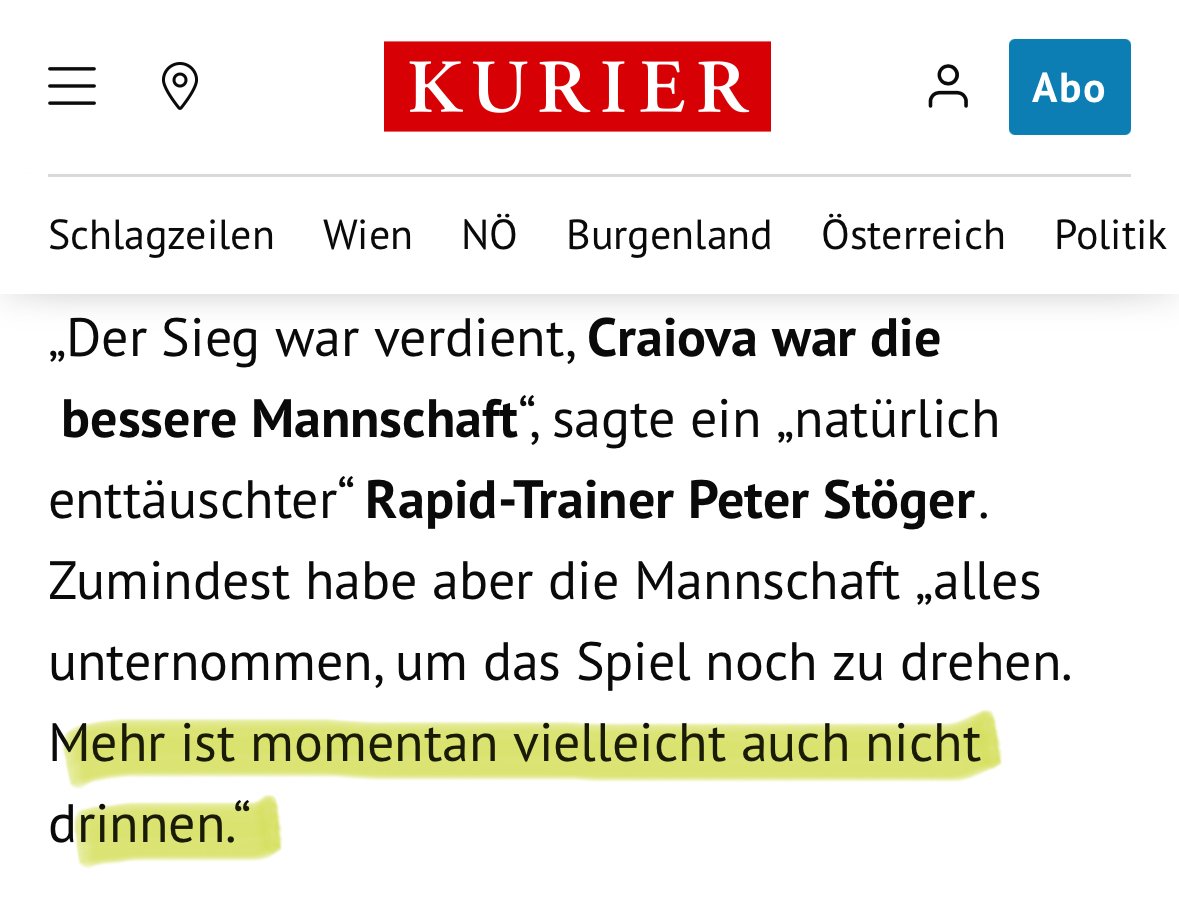baeckerbua V.I.P. Geschrieben vor 7 Stunden mari87 schrieb vor 10 Minuten: Nach so einer Aussage musst du einen Trainer eigentlich direkt entlassen. Wenn drei Verletzte dafür sorgen, dass gegen eine Irgendwas-Mannschaft aus Rumänien nicht mehr als ein 0:1 drinnen ist, bei dem die Spieler noch dazu ähnlich planvoll agieren wie die Tauben auf dem Stephansplatz, dann können wir den Profibetrieb bei Rapid einstellen. Ich hätte jetzt gerne einen Trainer, der schon der Meinung ist, dass vielleicht auch mehr drin ist. Das wirkt jetzt wirklich nicht sonderlich kämpferisch. Wir haben mit deutlich limitierteren Kickern gegen weit bessere Teams Siege errungen. Allein durch Wille und Aufopferung. Wahnsinn, Stöger umgehend zum Mediacoaching. 0 Zitieren Diesen Beitrag teilen Link zum Beitrag Auf anderen Seiten teilen More sharing options...