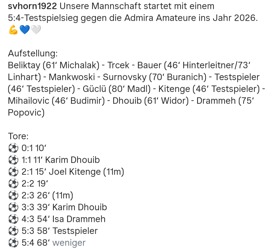 Kiebitz Stammspieler Geschrieben 2. Dezember 2025 Bepperl schrieb vor 14 Stunden: Zinkel zur NÖN: https://m.noen.at/meinfussball/regionalliga-ost/sv-horn-keine-shopping-tour-fuer-horn-es-wird-keine-transferoffensive-geben-499892144 Klingt ja recht vernünftig. Potential ist sicher vorhanden, vielleicht ergibt sich eine punktuelle Verstärkung. Könnte ein spannendes Frühjahr werden. 2 Zitieren Diesen Beitrag teilen Link zum Beitrag Auf anderen Seiten teilen More sharing options...