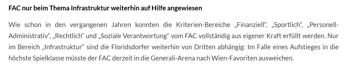 sportfreund1 Posting-Maschine Geschrieben vor 8 Stunden Lukas3482 schrieb vor 32 Minuten: https://www.oefbl.at/de/news/artikel/senat-5-urteile-des-lizenz-und-zulassungsverfahrens-fuer-die-saison-2025-26 Der FAC hat in den letzten Jahren immer um die Lizenz angesucht und diese auch immer ohne Auflagen erhalten, die würden definitiv Aufsteigen wenn sie die Möglichkeit dazu haben. Da wäre ich mir nicht so sicher. Was ich weiß gibt es von der Bundesliga gewisse Prämien wenn man den Verein so aufstellt dass er für die Zulassung für die höchste Spielklasse erhalten kann. Aber im Fall des FAC sehe ich da vor allem in Sachen Stadion nur wenig Chance, die aktuelle Spielstätte zu adaptieren ist aus meiner Sicht nur schwer möglich und ein dauerhaftes Ausweichen ins Happel oder ein anderes taugliches Stadion in Wien oder gar die Südstadt wäre für den Fac wohl aus mehreren Gründen keine gute, zukunftsfähige Lösung. Einerseits kostet es viel Geld und andererseits würde der Verein die lokale Verwurzelung verlieren und grad die ist den Verantwortlichen sehr wichtig. Daher glaube ich, dass sie am Ende die Bremse betätigen und sich mit einem 2. oder 3. Platz zufrieden geben würden. 0 Zitieren Diesen Beitrag teilen Link zum Beitrag Auf anderen Seiten teilen More sharing options...