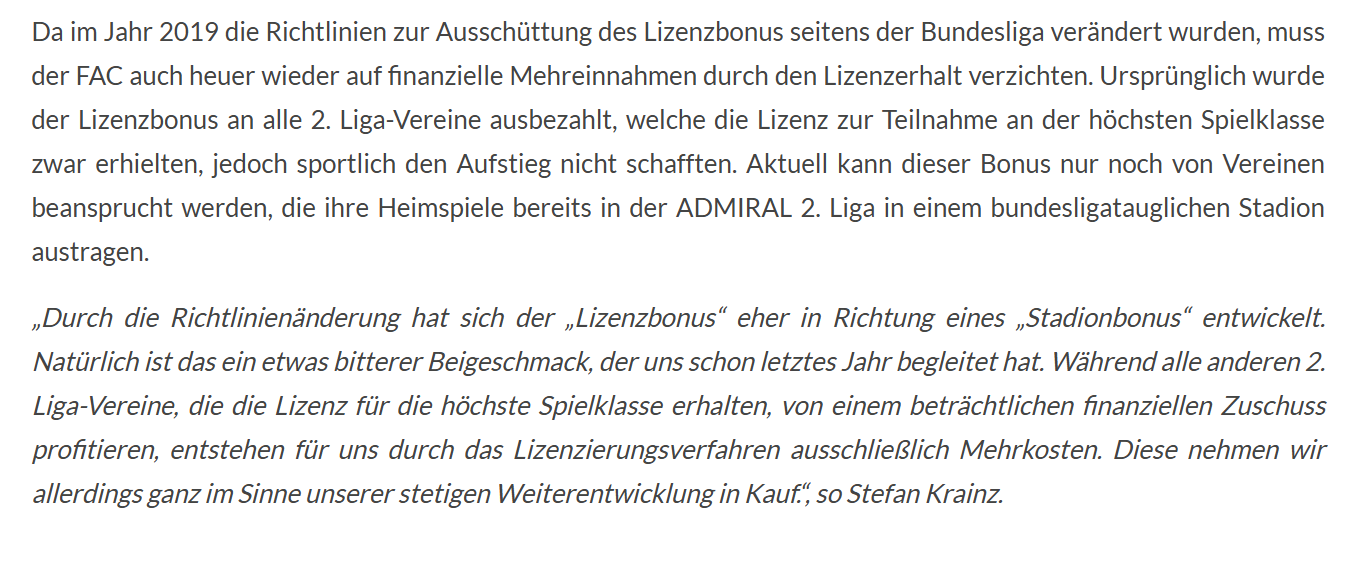 Lukas3482 Tribünenzierde Geschrieben vor 7 Stunden sportfreund1 schrieb vor 45 Minuten: Da wäre ich mir nicht so sicher. Was ich weiß gibt es von der Bundesliga gewisse Prämien wenn man den Verein so aufstellt dass er für die Zulassung für die höchste Spielklasse erhalten kann. Aber im Fall des FAC sehe ich da vor allem in Sachen Stadion nur wenig Chance, die aktuelle Spielstätte zu adaptieren ist aus meiner Sicht nur schwer möglich und ein dauerhaftes Ausweichen ins Happel oder ein anderes taugliches Stadion in Wien oder gar die Südstadt wäre für den Fac wohl aus mehreren Gründen keine gute, zukunftsfähige Lösung. Einerseits kostet es viel Geld und andererseits würde der Verein die lokale Verwurzelung verlieren und grad die ist den Verantwortlichen sehr wichtig. Daher glaube ich, dass sie am Ende die Bremse betätigen und sich mit einem 2. oder 3. Platz zufrieden geben würden. Den Lizenzbonus, den du meinst, bekommt man nur, wenn man in der laufenden Saison in einem bundesligatauglichen Stadion spielt und die Lizenz für die Bundesliga erhält. Beim FAC ist Ersteres nicht der Fall, darum bekommen sie diesen Bonus nicht. Folglich ergibt eine Lizenz nur Sinn, wenn man auch vorhat aufzusteigen. Finanziell rentiert sich die Bundesliga ohnehin für jeden Verein mehr als die zweite Liga. https://fac.at/fac-wien-erhaelt-erneut-die-bundesliga-lizenz/ https://cdn.bundesliga.at/downloads/2025-07-03/BL2-Finanzrichtlinien_ab 01072025_final.pdf Im Falle eines Aufstiegs würden sie in die Generali Arena ausweichen: https://fac.at/bundesliga-lizenz-fuer-den-fac-wien/ 0 Zitieren Diesen Beitrag teilen Link zum Beitrag Auf anderen Seiten teilen More sharing options...