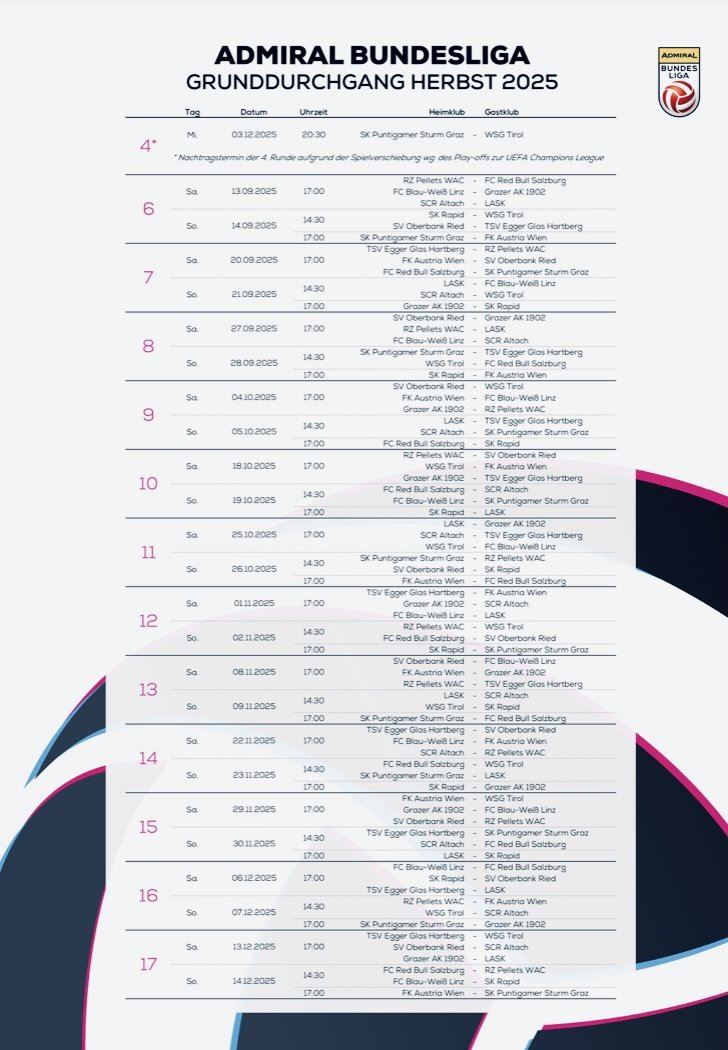 WAC_Ghostwriter ASB-Gott Geschrieben 1. September (bearbeitet) Der finale Spielplan für den Herbst ist da. https://skysportaustria.at/runde-6-bis-17-terminiert-bundesliga-gibt-finalen-spielplan-fuer-herbstsaison-bekannt/ https://www.instagram.com/share/_sF3HMRFN bearbeitet 1. September von WAC_Ghostwriter 2 Zitieren Diesen Beitrag teilen Link zum Beitrag Auf anderen Seiten teilen More sharing options...