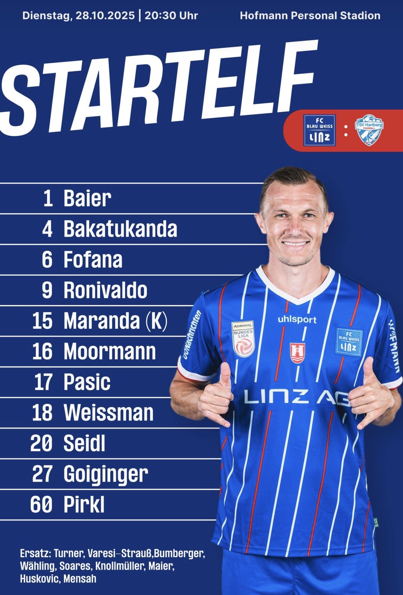 oldschool Wahnsinniger Poster Geschrieben vor 9 Stunden gleiche Aufstellung wie gg Wattens, wenn ich mich recht erinnere. Briedl nicht im Kader (keine Ahnung wieso) - dafür Soares zumindest auf der Bank. Reiter und Cvetko wohl weiterhin verletzt. 0 Zitieren Diesen Beitrag teilen Link zum Beitrag Auf anderen Seiten teilen More sharing options...