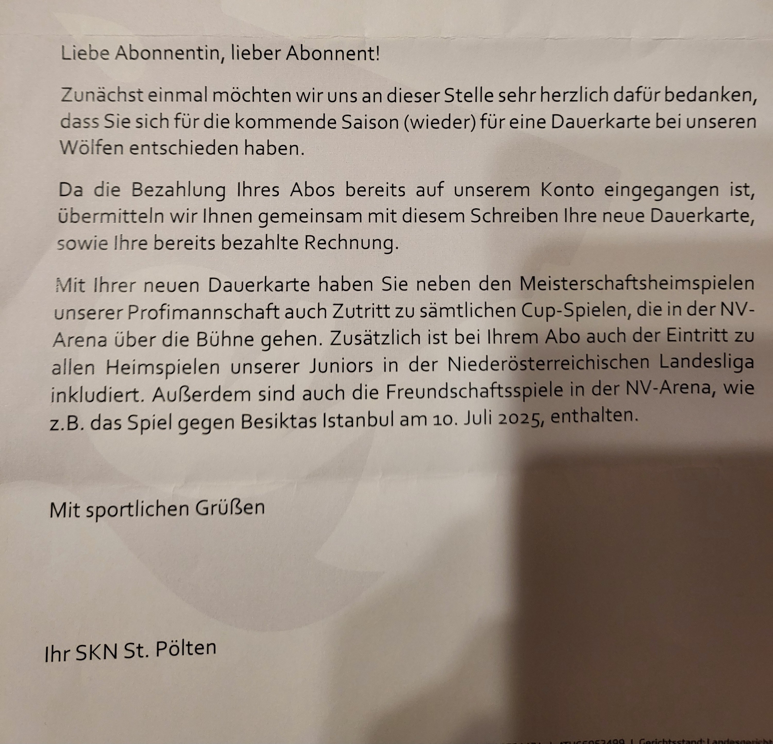 Saclic Postinho Geschrieben 30. September Wolfsfan schrieb vor 8 Minuten: Steht wo? auf der Homepage findet sich zu den ABOs 2025/26 folgender Zusatz: für alle Heimspiele der Admiral 2. Liga sowie etwaige Relegations- und Freundschaftsheimspiele in der NV-Arena. Hast auf deinem Abo Classic Plus+ oder nur Classic stehen? 0 Zitieren Diesen Beitrag teilen Link zum Beitrag Auf anderen Seiten teilen More sharing options...