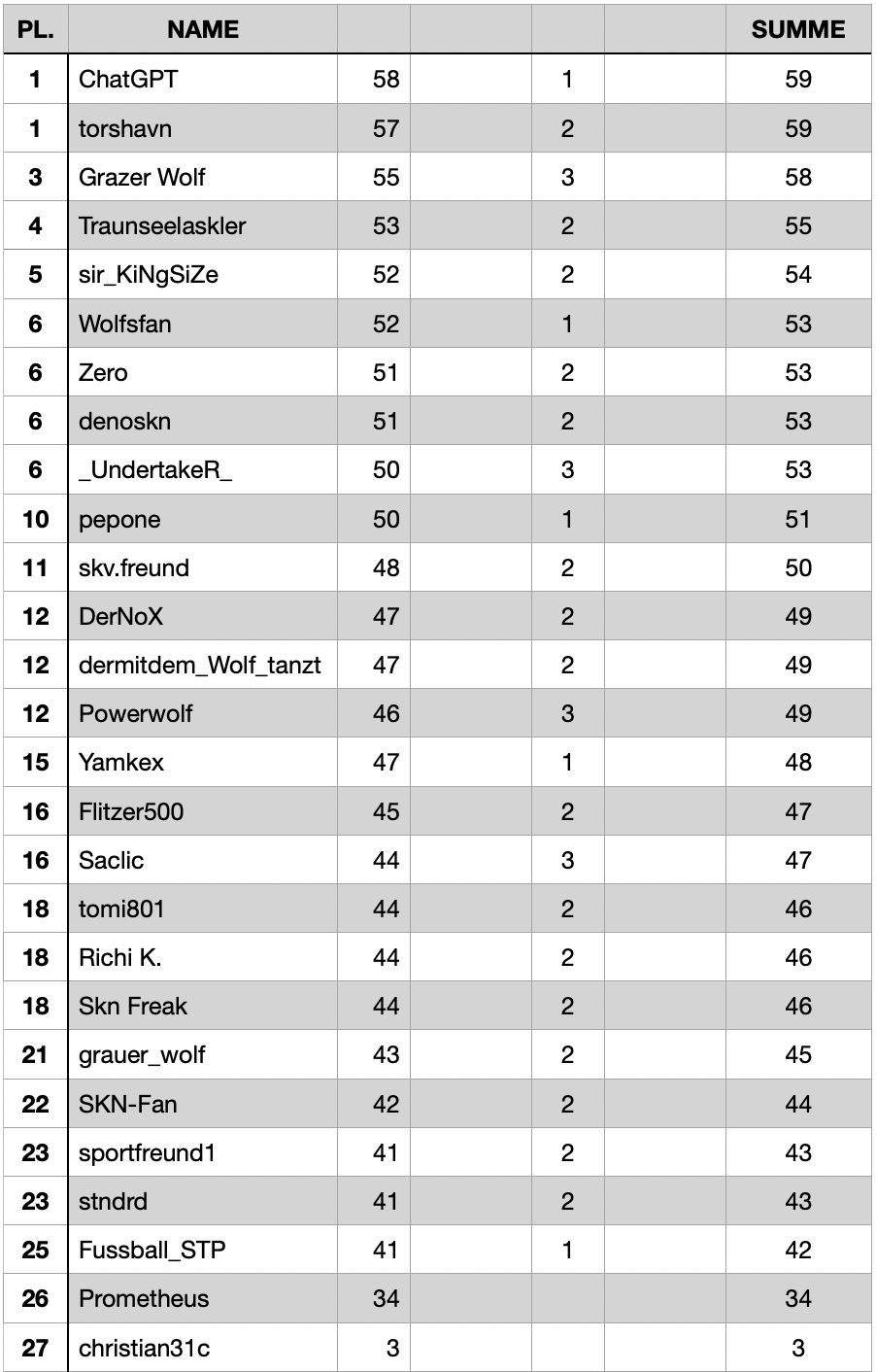 _UndertakeR_ Channel 9 - Mod Geschrieben vor 8 Stunden Zwischenstand nach Runde 22: 1 9 0 2 Graz schrieb am 20.3.2026 um 12:57 : Wie geil! Du lässt ChatGPT mittippen? Wie oft lag der KI-Bot schon richtig? Wie man am Zwischenstand sieht, schlägt sich die KI nicht so schlecht 0 Zitieren Diesen Beitrag teilen Link zum Beitrag Auf anderen Seiten teilen More sharing options...