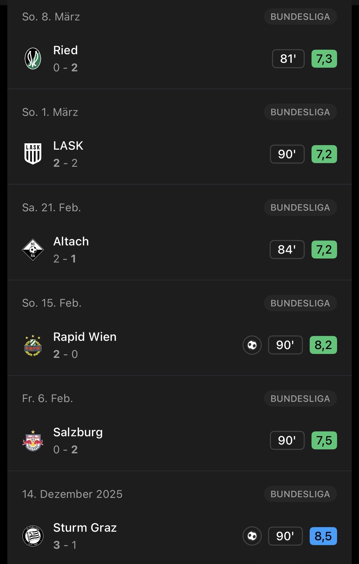 Ich weiß du magst meine Postings nicht bzgl. Ranftl, aber was sagen diese Statistiken jetzt aus über den offensiven Wert von Ranftl? Er hat 2 Tore gemacht und noch keinen Assist auf dieser Position, seine Statistiken sind geschönt, weil er für die zurückgelegten Meter sehr hohe Werte erhält auf Sofascore und natürlich dann wenn ihm ein Tor gelingt. Seine Defensiv Statistiken sind eher unterdurchschnittlich und seine Passwerte grauenhaft. Zumindest war das mein Conclusio aus den geposteten Statistiken seit 2026 im Vergleich zu Pazourek.