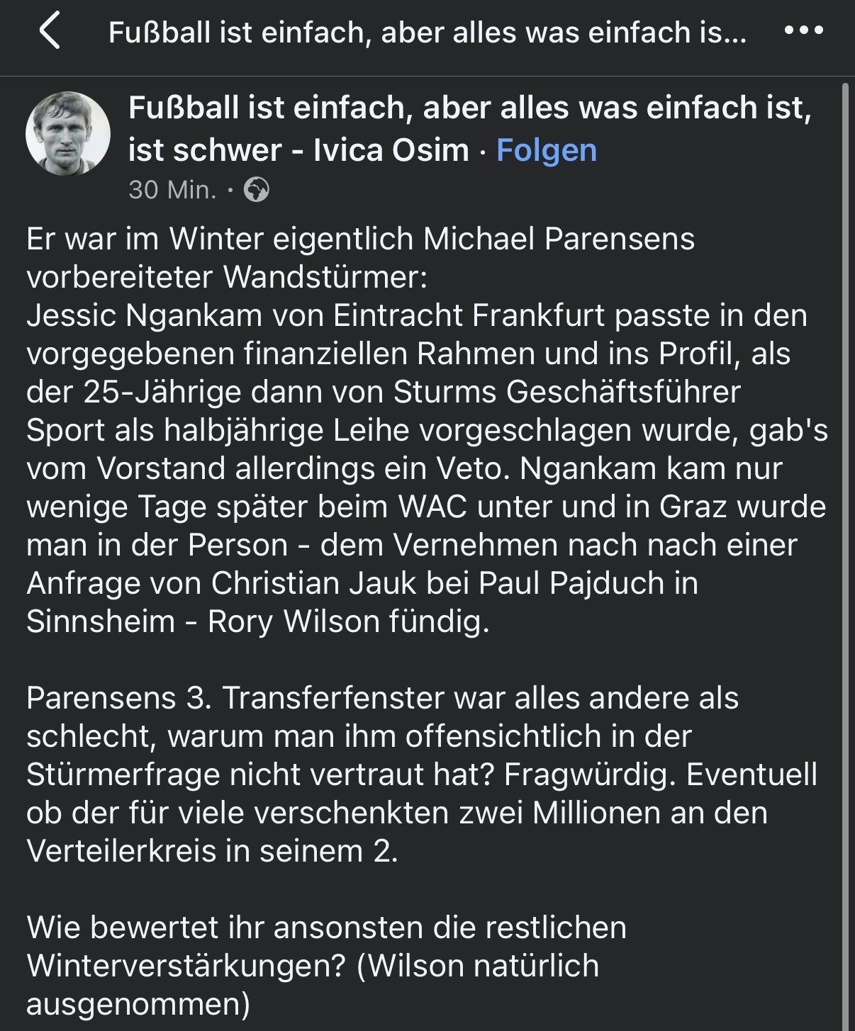 arlathii Fanatischer Poster Geschrieben 25. März Egal ob an dieser Story jetzt was dran ist, es gibt mittlerweile so viele Gerüchte, dass man sich fast sicher sein kann, dass sich Jauk und der Vorstand regelmäßig bei Verpflichtungen einmischen. Und das scheinbar oft auch, wenn es am finanziellen nicht scheitern würde, sondern einfach nur aufgrund von persönlichen Präferenzen. Man kann ja von Parensen halten was man will, aber mehr sportliche Expertise als alle Leute im Vorstand hat er sicher. Wenn man seiner Meinung nicht vertraut, dann braucht es eben einen neuen Sportdirektor, aber ich bekomme so langsam das Gefühl, dass das genau so gewollt ist... 6 Zitieren Diesen Beitrag teilen Link zum Beitrag Auf anderen Seiten teilen More sharing options...