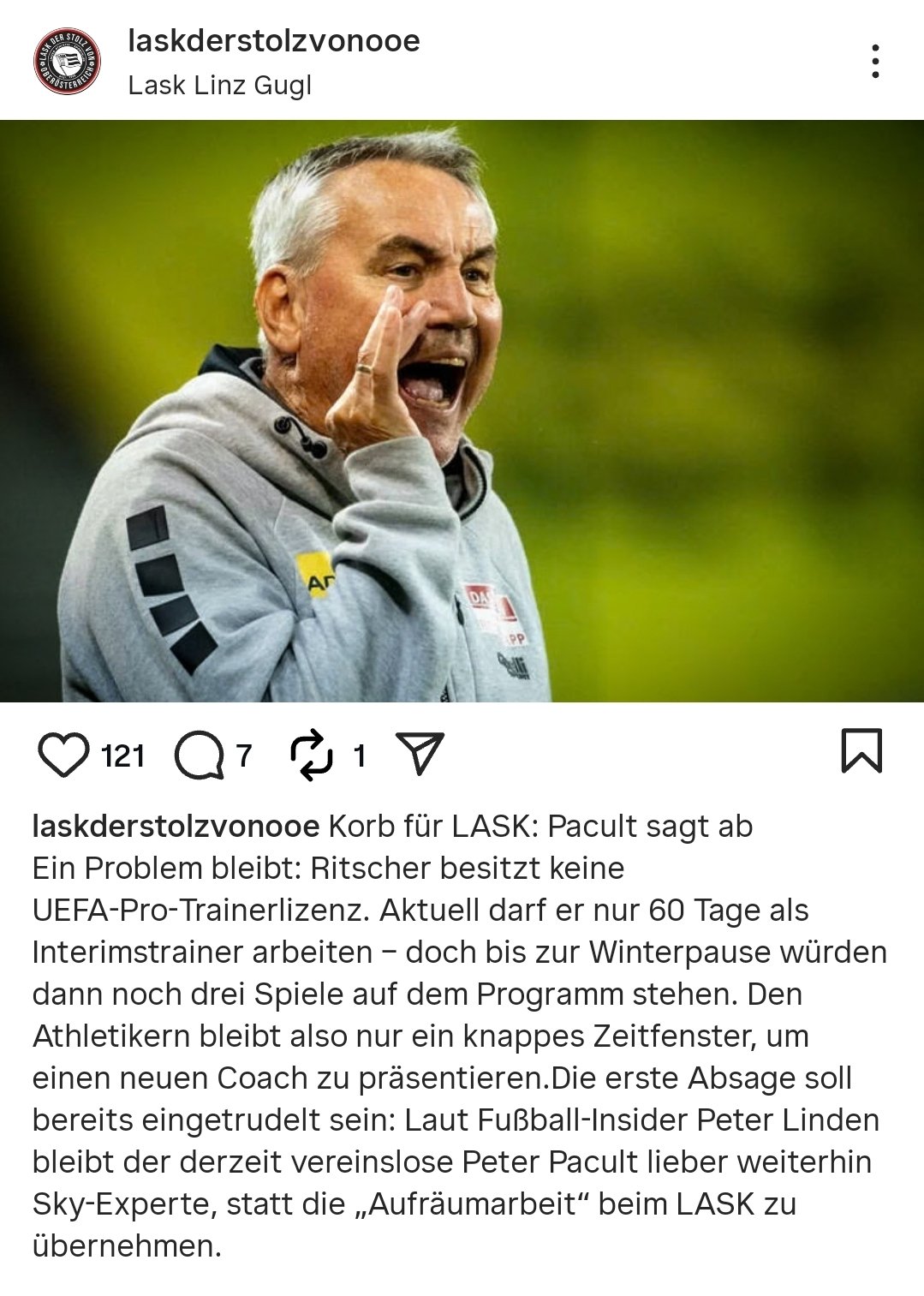 Traunseelaskler ASB-Legende Geschrieben 24. September Hörschinger schrieb vor 3 Minuten: Pacult dürfte abgesagt haben Die Quelle OE24 basierend auf Linden ist halt nicht besonders gut. Zumal Linden hier auch nur geschrieben hat, was er sich denkt: Zitat Wer in Linz nach der Interimslösung Ritscher die endgültige wird? Alle, die darauf tippen, dass Peter Pacult zum LASK kommen wird, liegen garantiert falsch. Unmöglich, dass es zwischen Gruber und Pacult funktionieren kann. Lieber bleibt er Experte bei Sky als sich mit 66 Jahren dies anzutun. https://peterlinden.live/nach-derbysieg-trainerwechsel-lask-kommt-nicht-zur-ruhe/ Der Link ist nur der Vollständigkeit halber da, grundsätzlich sträube ich mich dagegen, Quellen wie OE24 oder Linden anzuklicken. 10 Zitieren Diesen Beitrag teilen Link zum Beitrag Auf anderen Seiten teilen More sharing options...