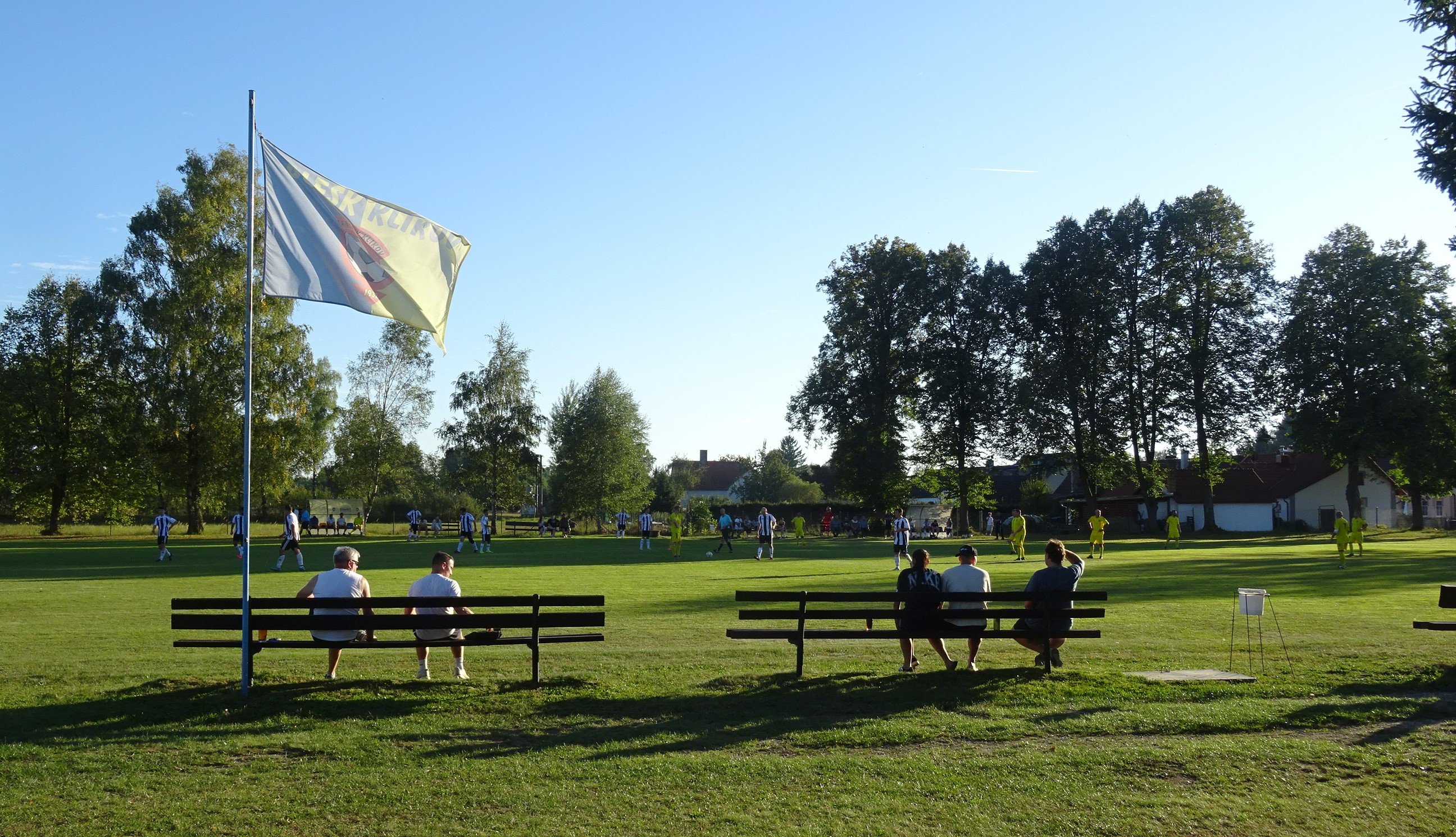 Da wir zum nächsten Spiel in Klikov ebenfalls nur wenige Kilometer zurücklegen mussten, besorgten wir uns in Chlum noch ein Erfrischungsgetränk und besuchten dort noch die Kirche und das Schloss, ehe es zum zweiten Spiel der Gruppe A in der 9.Liga im OFS Jindřichův Hradec an diesem Tag gehen sollte. In diesem kam es in der 5.Runde zu einem Verfolgerduell zwischen dem heimischen TJ Blesk Klikov und dem TJ Sokol Lodhéřov. Da beide Teams gut in die Saison gestartet sind, kommen auch 80 Besucher auf den der Spielklasse entsprechenden Sportplatz. Dass mich dieser an den Platz vom USV Brand erinnert, liegt nicht nur an den Birken, sondern auch daran, dass sich dieser nur wenige Kilometer von hier hinter der Grenze im Waldviertel befindet.