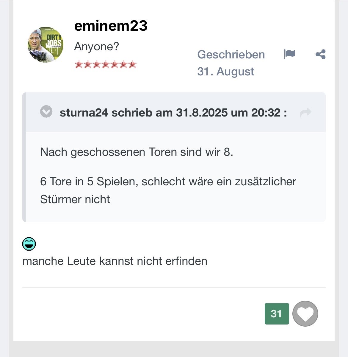 nopowertothebauer Im ASB-Olymp Geschrieben Sonntag um 19:34 NaughtyBertl schrieb vor 3 Minuten: Man kann nur hoffen, dass der Frust, der hier lesbar ist, auch gerade in der Kabine herrscht. Und auch in den Ebenen darüber. Unsere Spieler der letzten Saison, die wesentlich günstiger sind, haben sich in den Spielen wenigstens zerfetzt um ein Derby zu gewinnen. Unsere Millionentransfers von heuer haben offenbar noch nie was von den Violetten gehört, sonst wüssten sie, wie wichtig dieses Spiel für Verein, Fans und die Gesamtsituation ist. Hoffentlich war dieses Spiel der Schuss vor den Bug, den alle brauchen, um aufzuwachen. Wir sind gut dagestanden, weil wir in den ersten Runden auch mit Glück aber mit 110% gespielt haben. Jetzt sind wir eine arrogante Legionärstruppe, die schon geglaubt hat der neue Meister zu sein. Abputzen, aufstehen, endlich zu arbeiten beginnen und kämpfen ist jetzt angesagt. Eher ein Schuss in den Bug tbh. 1 Zitieren Diesen Beitrag teilen Link zum Beitrag Auf anderen Seiten teilen More sharing options...