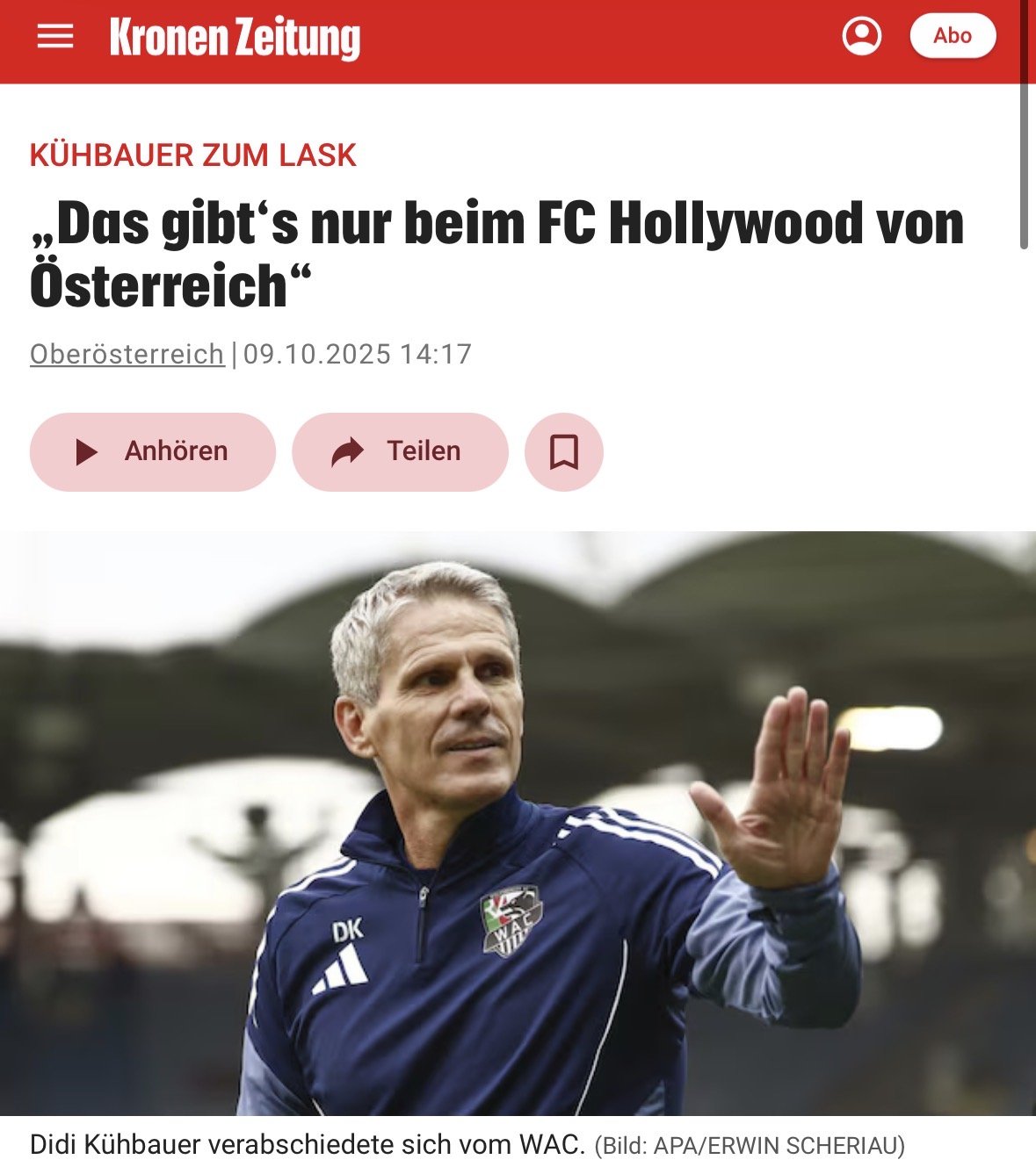 ElCapitano4040 Ergänzungsspieler Geschrieben Gestern um 13:37 MegamanX schrieb vor 10 Minuten: Um Mr Krabs zu zitieren: "Money!" Vielleicht auch einfach weil ein Typ wie Kühbauer, der viel über die Emotionen macht, im nebligen, kalten und verregneten Lavanttal vor 4000 Zuschauer ein Fremdkörper ist? Sportlich hat er absolute Top-Arbeit geleistet, das steht außer Frage. Trotzdem gibt der LASK dem Didi genauso viel wie er (hoffentlich) uns. 1 Zitieren Diesen Beitrag teilen Link zum Beitrag Auf anderen Seiten teilen More sharing options...