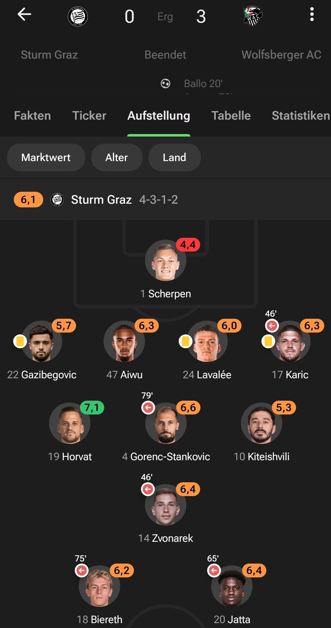 Was mich viel mehr gestört hat, dass man auch nach dem 0:2 keinen Ruck gesehen hat, das 0:3 war folgerichtig die Konsequenz. Die Wechsel in der ersten Hälfte leider nötig, um ein Zeichen zu setzen, ich will jetzt auch nicht auf die ausgewechselten hindreschen, weil bis dahin leider alle die nötige Einstellung vermissen haben lassen. Von da weg, war es eine andere Partie, Rozga ganz klar das Highlight, Tomi hat wieder einmal versucht was ging, als Kite drin war, hatte er auch seine Lieblingsanspielperson und letztlich hat man sich das 1:3 auch erarbeitet. Leider war das halt zu dem Zeitpunkt einfach schon zu spät, daran konnte auch die völlig unnötige, aber regelkonforme gelb-rote Karte für Baumgartner nichts mehr ändern. Der WAC hat das einfach zu clever zu Ende gespielt, bei uns fielen zu viele Schüsse aus der Distanz harmlos aus oder gingen über das Tor, der gefährlichste war eh noch der von Rozga.