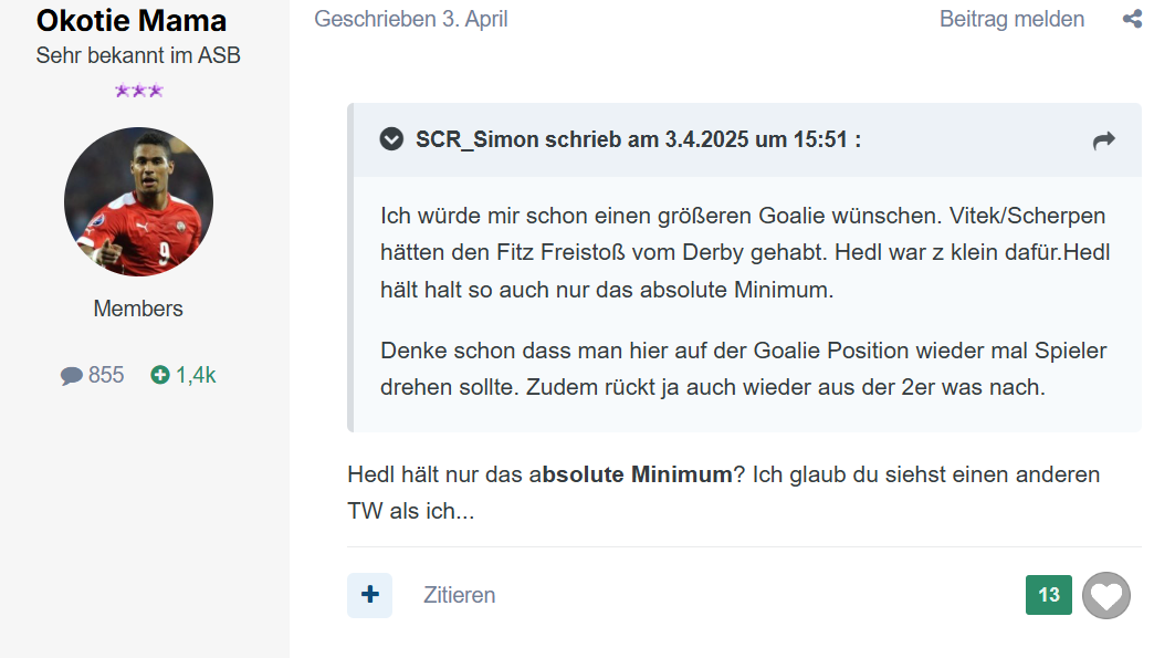 SCR_Simon Postaholic Geschrieben vor 5 Stunden Ich finds halt schon komisch, dass das ASB immer auf Spieler nach Fehlern draufhaut. Im April habe ich schon angemerkt, dass Hedl für mich kein guter Goalie ist und wurde dafür komplett belächelt. Jetzt, wo man die Schwächen stärker sieht, wird draufgehaut. 3 Diesen Beitrag teilen Link zum Beitrag Auf anderen Seiten teilen More sharing options...