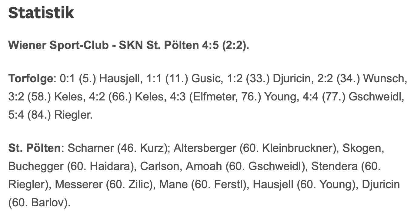 St. Pöltner Suderant Ergänzungsspieler Geschrieben vor 18 Stunden War ein 5:4 Sieg. Erste Halbzeit hätte aufgrund der Chancen vom Ergebnis her klarer sein müssen + eben angesprochene Fehler bei den Gegentoren. Ansonsten dann gut durchgewechselt, Hisamatsu und Haidara von den Juniors waren auch dabei. Ferstl war top im 1v1, der hat echt Dampf gemacht. Rieglers Tor am Ende war aus einem Eckball per Kopf. 1 Zitieren Diesen Beitrag teilen Link zum Beitrag Auf anderen Seiten teilen More sharing options...