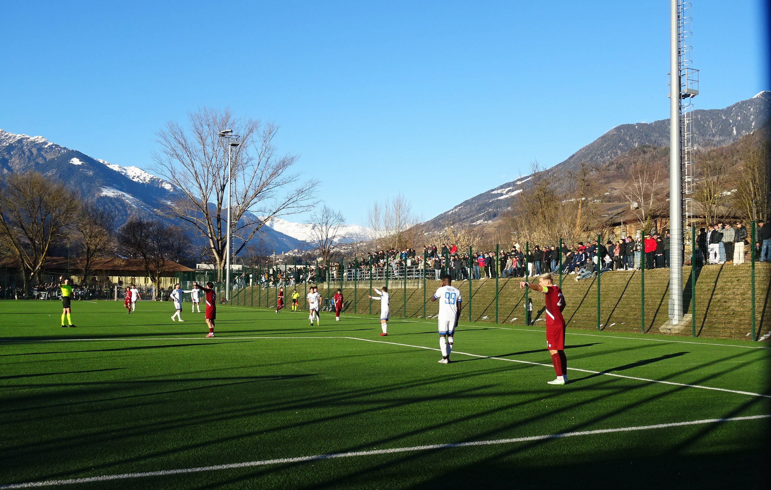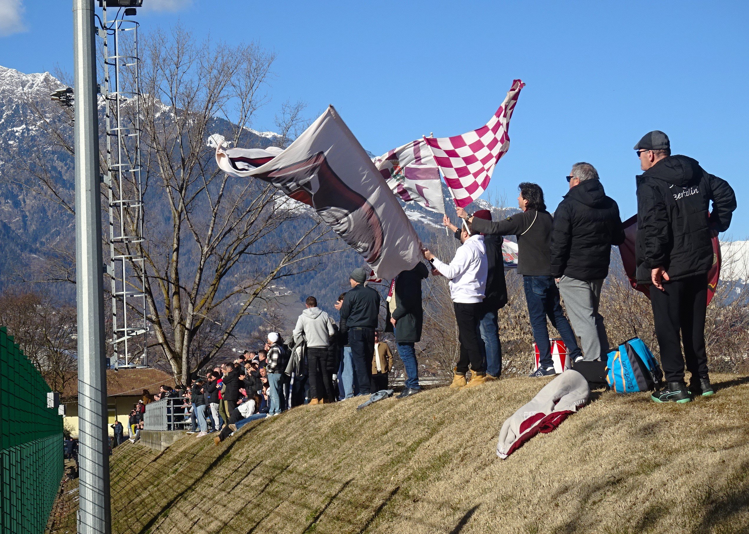 Heffridge "Inside everyone there´s a litte nut!" Geschrieben vor 11 Stunden (bearbeitet) Am Sonntag war es geplant, dem FC Obermais auf der Lahn einen Besuch abzustatten. Doch leider verhinderte das Schlechtwetter der vergangenen Woche den Besuch des altehrwürdigen Heimplatzes des Südtiroler Viertligisten, denn der FC Obermais musste aufgrund der Unbespielbarkeit des Rasen das für diesen Sonntag angesetzte Heimspiel gegen ASD Portogruaro Calcio auf den Kunstrasenplatz in Sinich verlegen. Sinich bzw. Sinigo ist ein im Süden Merans befindlicher Ortsteil. Der Kunstrasenplatz in Sinich, der unter dem Namen Sinigo Arena geführt wird, verfügt immerhin über einen Ausbau auf der Hangseite, auf der sich auch eine kleine, unüberdachte Tribüne befindet. Er dient dem USD Sinigo und dem Rugbyverein Meran Dragons als Heimstätte. Nachdem wir am Vormittag die Kurstadt Meran besichtigten, erreichen wird Sinich rund eine Stunde vor Spielbeginn. Es herrscht hier noch gähnende Leere, aber das sollte sich ändern, je näher der Anpfiff rückt. Um 14:30 Uhr ist dann nicht nur die Tribüne voll, sondern es sind auch die Stehplätze auf der Hangseite sehr gut gefüllt. Am Südende der Hangseite hat sich auch eine Abordnung aus Portogruaro eingefunden, die rund 10 Mann stark ist, einige Transparente aufgehängt hat und ihre Mannschaft sowohl lautstark als auch mit Fahnen unterstützt. Die Curva Sud Obermais befindet sich heute auf der nördlichen Hintertorseite beim Eingang, wo man sich mit Bänken auch Erhöhungen geschaffen hat, um einen kompakten Block bilden zu können. Fanunterstützung ist nämlich heute für beide Seiten wichtig, denn es ist quasi das Spiel der letzten Chance für beide Vereine um einem Abstieg zu entgehen, denn es trifft der Tabellenvorletzte auf den Tabellenletzten der Girone C der viertklassigen Serie D. Allerdings hat Obermais bereits sechs Punkte Vorsprung auf Schlusslicht Portogruaro und ist nebenbei auch klar formstärker, sodass von den wohl um die 450 Besucher in Sinich heute wohl die meisten auf einen Pflichtsieg hoffen. Unter der tollen landschaftlichen Kulisse mit den Bergen bei Sonnenschein im Hintergrund des Platzes geht Obermais bereits in der achten Minute durch Jungspund Stecher in Führung, der einen Angriff von rechts mit einem satten Schuss ins lange Ecke abschließen kann. Dieser Auftakt nach Maß sollte für die Meraner in der 21. Minute noch vergoldet werden, denn der Kapitän Portogruaros kann einen Ball im Mittelfeld nicht unter Kontrolle bringen und da seine Mannschaft aufgerückt ist, kann Mittelstürmer Brusco alleine aufs Tor laufen und zum 2:0 einschieben. Alles ist angerichtet für einen Obermaiser Sieg und auch nach der Pause ist Momentum auf der Seite der Meraner. Bereits in der 51. Minute gibt Schiedsrichter Ambrosini nach einem klaren Foul im Strafraum Elfmeter für die Südtiroler und diesen verwertet Brusco eiskalt. Nur vier Minuten später tankt sich der slowakische Neuzugang Spalek, der sich auf diesem Terrain eindeutig besser zurecht findet als auf den derzeit tiefen und unebenen Rasenböden, auf der linken Seite durch und spielt den Ball zum in der Mitte lauernden Österreicher Bauernfeind, der überlegt aus kurzer Distanz einschieben kann. Mit dem 4:0 im Rücken kann es sich Obermais nun leisten, Brusco zu schonen und Neuzugang Ngom im Sturm Spielpraxis zu geben. Die Winterneuverpflichtung hat auch einige gute Momente, war aber im Abschluss zumeist noch zu überhastet. Auf Seiten Portogruaros gab es kein Aufbäumen mehr, sodass die mitgereisten Tifosi ein Viertelstunde vor Schluss ihre Sachen packten und lautstark vorzeitig den Platz verließen. Diese wurde von der Curva Sud Obermais mit Applaus und einem "Ciao Ragazzi!" gewürdigt. Auf dem Rasen tat sich danach nicht mehr viel und Obermais konnte nach dem bisher höchsten Sieg in der Serie D mit drei weiteren Punkten auf dem Konto den direkten Konkurrenten Adriese überholen. Damit konnte man auch einen direkten Abstiegsplatz verlassen und hätte derzeit ein Play Out-Spiel um den Klassenerhalt. Eine sichtlich erleichterte Obermaiser Mannschaft kommt danach zur Verabschiedung in die Kurve, wo man diesen heroischen Erfolg gemeinsam feiert. Die Curva Sud Obermais hat aber schon weitere Pläne und stimmt mit einem Schmunzeln ein "Andiamo in Serie C!" an. Da muss auch die Mannschaft schmunzeln, aber in der derzeitigen Form mit sieben Punkten aus drei Spielen, ohne dabei ein Gegentor kassiert zu haben, ist es mittlerweile durchaus realistisch, dass das Abenteuer in der Serie D um ein weiteres Jahr verlängert werden kann. Wir verlassen danach Sinich und begeben uns über Bozen und den Brenner wieder heimwärts mit einem guten Gewissen, denn wir wissen, dass wir wieder kommen werden, um den FC Obermais auf der Lahn einen Besuch abzustatten. Idealerweise in der Serie D. FC Obermais - ASD Portogruaro Calcio 4:0 (2:0) bearbeitet vor 11 Stunden von Heffridge 0 Zitieren Diesen Beitrag teilen Link zum Beitrag Auf anderen Seiten teilen More sharing options...
