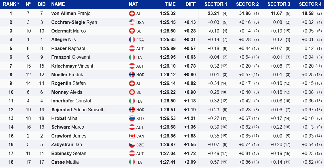 Wenn man die besten Einzelzeiten zusammenzählt kommt man auf 1:24:98 und somit 0,32 schneller als von Allmen.