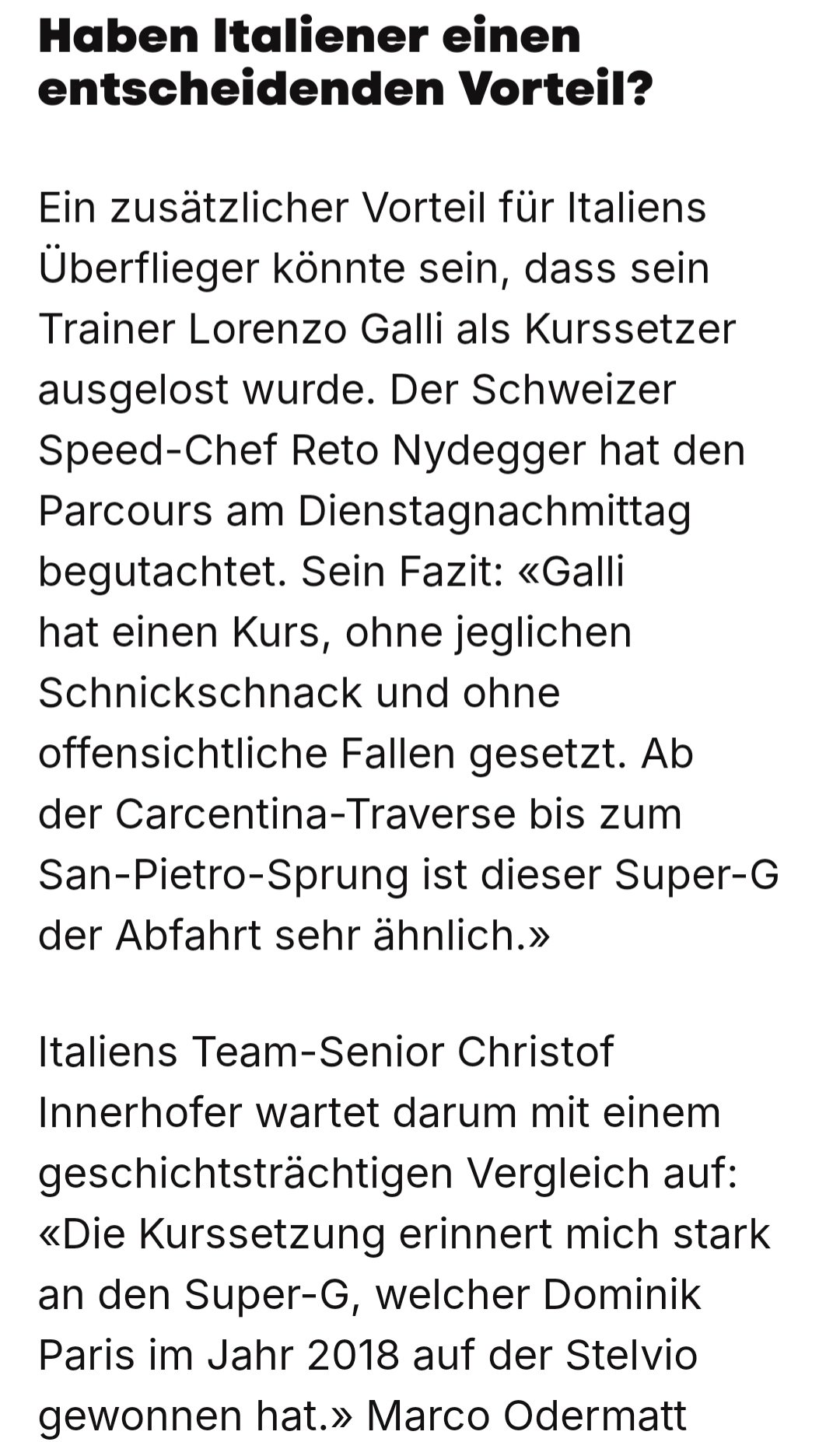 Darf ich fragen, woher du den Artikel hast? Ich finde es aber völlig Normal, dass man hier für Paris und Franzoni setzt. Gefährlich wird auch von Allmen, natürlich. Aber wie du sagst, es ist halt auch ob der fehlenden Ecken noch immer ein Super G. Es wird auf jeden Fall ein Gemetzel um die Medaillen!