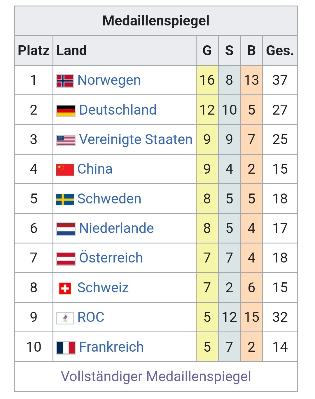PAT87 Im ASB-Olymp Geschrieben vor 1 Stunde (bearbeitet) PAT87 schrieb vor 8 Minuten: Italienische Festspiele. Ich hab mir den Medaillenspiegel von 2010 angesehen, vier Jahre nach den Heimspielen. Da hatte Italien lediglich 5 (!) Medaillen gewonnen. In vier Jahren in den Französischen Alpen werden wir dann vermutlich französische Festspiele erleben. Ich weiß jetzt nicht wie viele Chancen die Chinesen noch haben, aber die sind aktuell enttäuschend unterwegs im Vergleich zu den Heimspielen vor 4 Jahren: 2026: bearbeitet vor 1 Stunde von PAT87 0 Zitieren Diesen Beitrag teilen Link zum Beitrag Auf anderen Seiten teilen More sharing options...