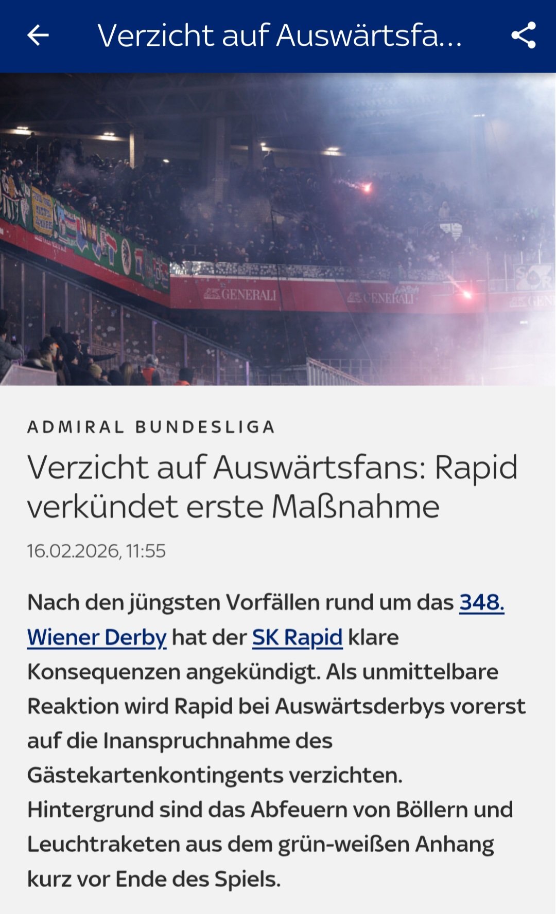 Hurricane Im ASB-Olymp Geschrieben vor 1 Stunde ardbeg schrieb vor 5 Minuten: was sagt er? Kann das Video hier in Asien nicht öffnen. In dem Video von Sky Sport Austria äußert sich Austria-Kapitän Manfred Fischer sichtlich emotional zu den Fan-Ausschreitungen beim 348. Wiener Derby (15. Februar 2026). Hier ist die Zusammenfassung bzw. das Transkript seiner wichtigsten Aussagen: Zum persönlichen Hintergrund: „Meine Frau, meine Schwester und meine Schwiegereltern waren da drüben [auf der Tribüne]. Sie sind dann gegangen, weil die Böller geflogen sind. Ich mache mir dann natürlich auch Sorgen.“ Zu seiner Meinung über die Vorfälle: „Wenn ich meine ehrliche Meinung sagen würde, hätte ich wohl ein Problem. [...] Mir tut es einfach extrem leid für den Fußball in Wien. Ich weiß nicht, was noch alles passieren muss, dass man versteht, was man damit anrichtet.“ Appell und Unverständnis: „Es gibt so große Probleme auf der Welt, warum muss man dann ein Fußballspiel auch noch zerstören? Ich verstehe es nicht.“ Fischer verdeutlichte in dem Interview, dass er sich „auf die Zunge beißen“ müsse, um nicht zu drastisch zu werden, da ihn die Situation – insbesondere aufgrund der Gefährdung seiner eigenen Familie im Stadion – extrem mitgenommen hat. Das Spiel musste aufgrund von Pyrotechnik-Würfen und Ausschreitungen im Block der Rapid-Fans für etwa 10 Minuten unterbrochen werden. 1 Zitieren Diesen Beitrag teilen Link zum Beitrag Auf anderen Seiten teilen More sharing options...