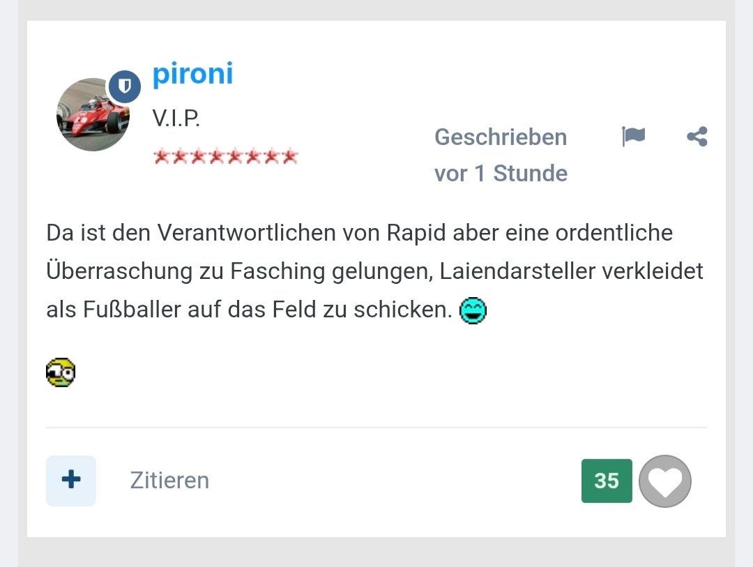 Inri666 Stammspieler Geschrieben vor 5 Stunden Schöner Derbysieg, fast ein bisschen zu einfach gegen die schlechteste Rapdi, die ich je gesehen habe. Habe mich bei der Bundesliga beschwert und Konsequenzen wie Geisterspiele, Punkteabzug und empfindliche Geldstrafen gefordert. Sollten möglichst viele von uns machen, damit endlich was passiert. Wenn dann auch noch das Gerücht stimmt, dass 80% des Kokainhandels in Wien über die West Tribüne läuft und die Polizei da drinnen nicht vorgehen kann ist das ja alles unbegreiflich. 0 Zitieren Diesen Beitrag teilen Link zum Beitrag Auf anderen Seiten teilen More sharing options...