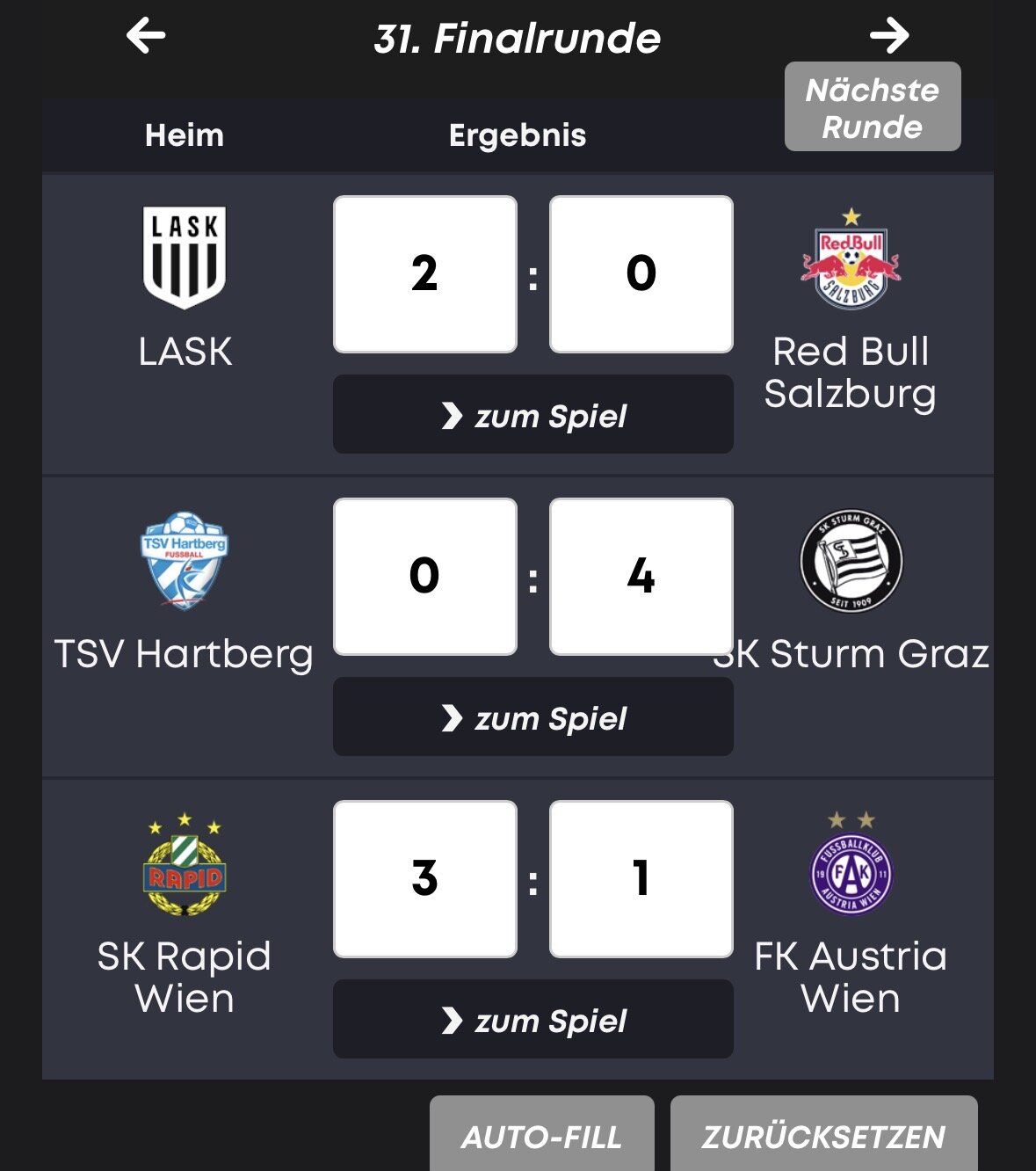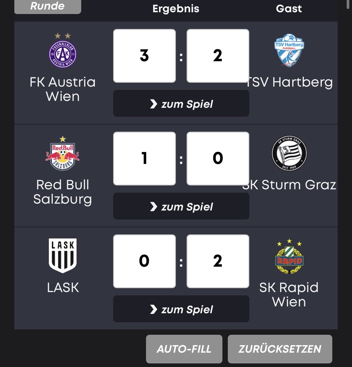 TimetoShine1899 Im ASB-Olymp Geschrieben vor 1 Stunde damich schrieb vor 1 Minute: Zwei Probleme, 1. Wäre der LASK bei diesen Ergebnissen vor uns (direktes Duelle ausgeglichen, aber bessere TD) 2. Hast du sturm die letzten Monate gesehen? 4:0 gegen hartberg ist absolut unrealistisch. hab bei sturm iwas eingegeben weil i denk sturm gewinnt zu 0 0 Zitieren Diesen Beitrag teilen Link zum Beitrag Auf anderen Seiten teilen More sharing options...