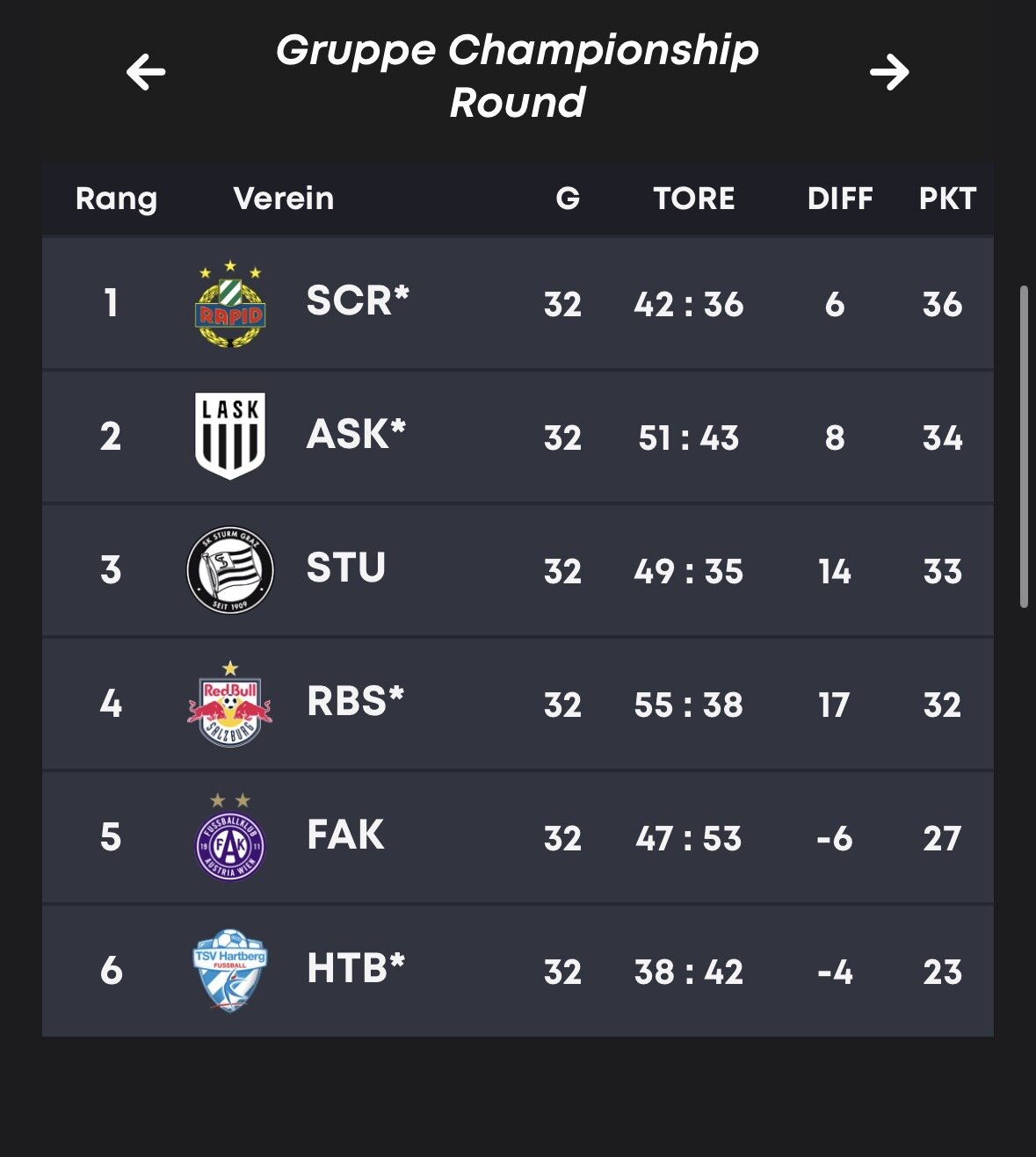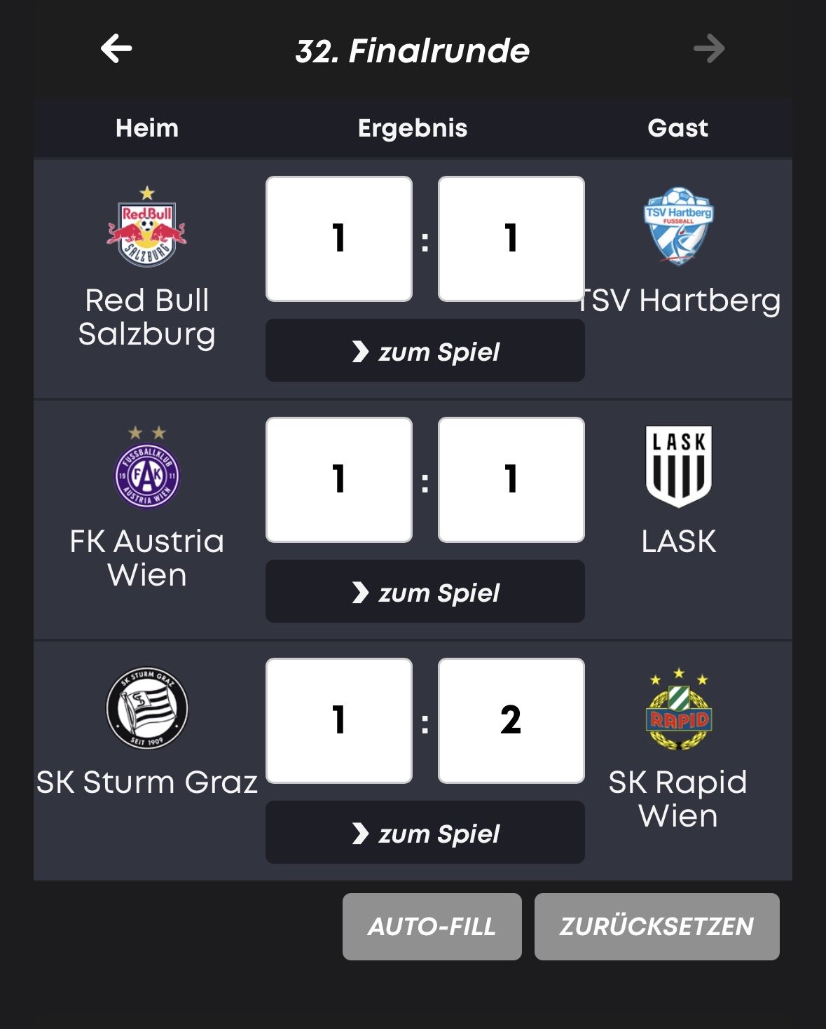 Hook1 Weltklassecoach Geschrieben vor 1 Stunde Ich hab gerade gesehen, dass man sogar noch auf Meister Hartberg wetten kann, obwohl das rechnerisch nicht mehr möglich ist. Bei der Austria hab ich ja schon den abenteuerlichen Weg zum Meister geschildert, aber bei Hartberg wäre es ja schon nötig, dass ein Spiel doppelt strafverifiziert werden müsste oder irgendwer Punkte abgezogen bekommt. 1 Zitieren Diesen Beitrag teilen Link zum Beitrag Auf anderen Seiten teilen More sharing options...
