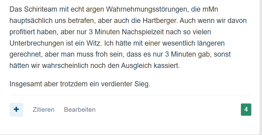 Altes Landgut ASB-Halbgott Geschrieben vor 7 Stunden (bearbeitet) brillantinbrutal schrieb vor 49 Minuten: Manche User verwenden es gerne als Stilmittel, strafrechtlich relevantes Verhalten (Beleidigung, Kreditschädigung, Verleumdung, usw) anderen Usern zuzuschreiben. Andere provozieren sogar gerne Äußerungen, die so gedeutet werden können. Unter (echten) Anhängern eines Vereines sollte man darauf eigentlich (Extremfälle ausgenommen) verzichten können. Hier ein Auszug aus dem Eintrag, den ich unmittelbar nach dem Spiel in Hartberg gepostet habe und der die Schiedsrichterleistung betrifft. Am Ende betone ich sogar noch, dass wir aufgrund der zu geringen Nachspielzeit womöglich noch von der Schiedsrichterleistung profitiert haben. Aufgrund der Aussage "Wenn der (Coulibaly) für uns auf die Art und Weise spielt wie letztens für Hartberg, kassiert der in jedem 3. Spiel eine Rote.", wird mir hier von einem User ein Betrugsvorwurf unterstellt. In anderen Postings habe ich Schiedsrichter Ebner sogar noch in Schutz genommen, weil es gegen ihn Morddrohungen in der Vergangenheit gegeben hat. Also ich muss schon sagen, das ist wirklich starker Tobak, was dieser User mir auf provokante Weise unterstellt. Oder liege ich komplett falsch? Habe ich tatsächlich Ebner einen Betrug vorgeworfen, ohne es zu merken? Für mich überschreitet diese Anschuldigung gegen mich eine Grenze, zumal ein nicht gerechtfertigter Betrugsvorwurf eine Straftat darstellen würde. bearbeitet vor 7 Stunden von Altes Landgut 3 Zitieren Diesen Beitrag teilen Link zum Beitrag Auf anderen Seiten teilen More sharing options...