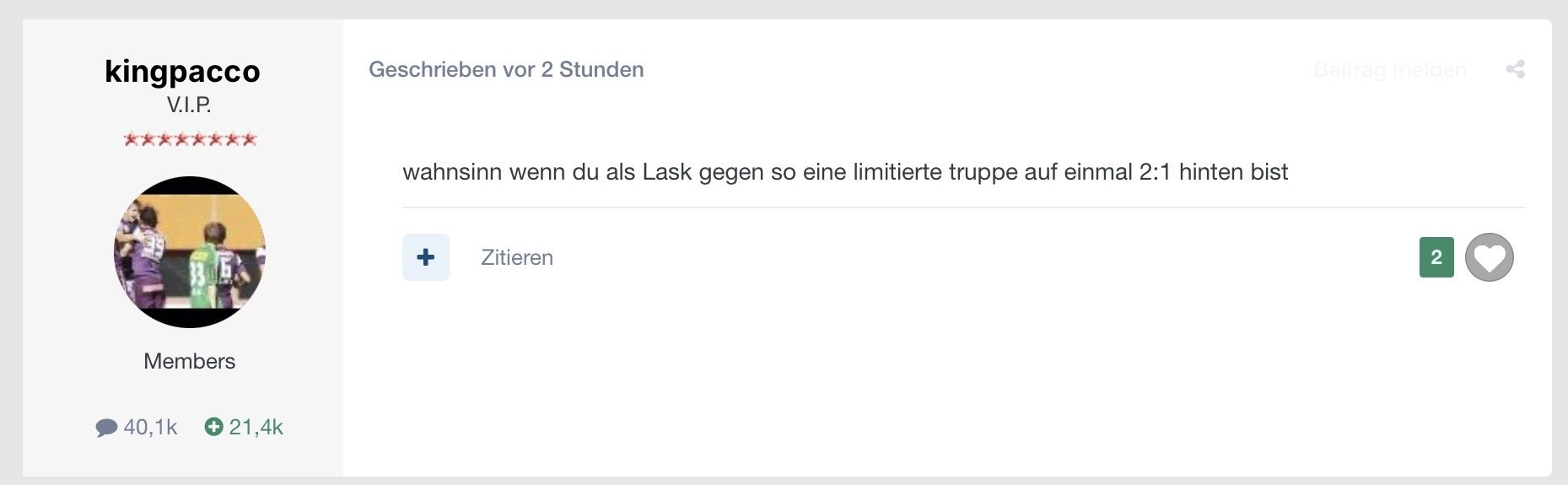 moerli V.I.P. Geschrieben vor 14 Stunden ofla4rocki schrieb vor einer Stunde: Mir taugt spielabhängiges Supporten besser als der einschläfernde Dauergesang der oft präsentiert wird. Stimmung war gut heute! Das sollte der BW auch machen, der Dauergesang der sogar weiter geht wenn wir ein Tor bekommen ist nicht Förderlich Aber dann wäre der BW eine große Hilfe für die Mannschaft wenn es laut wird bei guten Aktionen 4 Zitieren Diesen Beitrag teilen Link zum Beitrag Auf anderen Seiten teilen More sharing options...