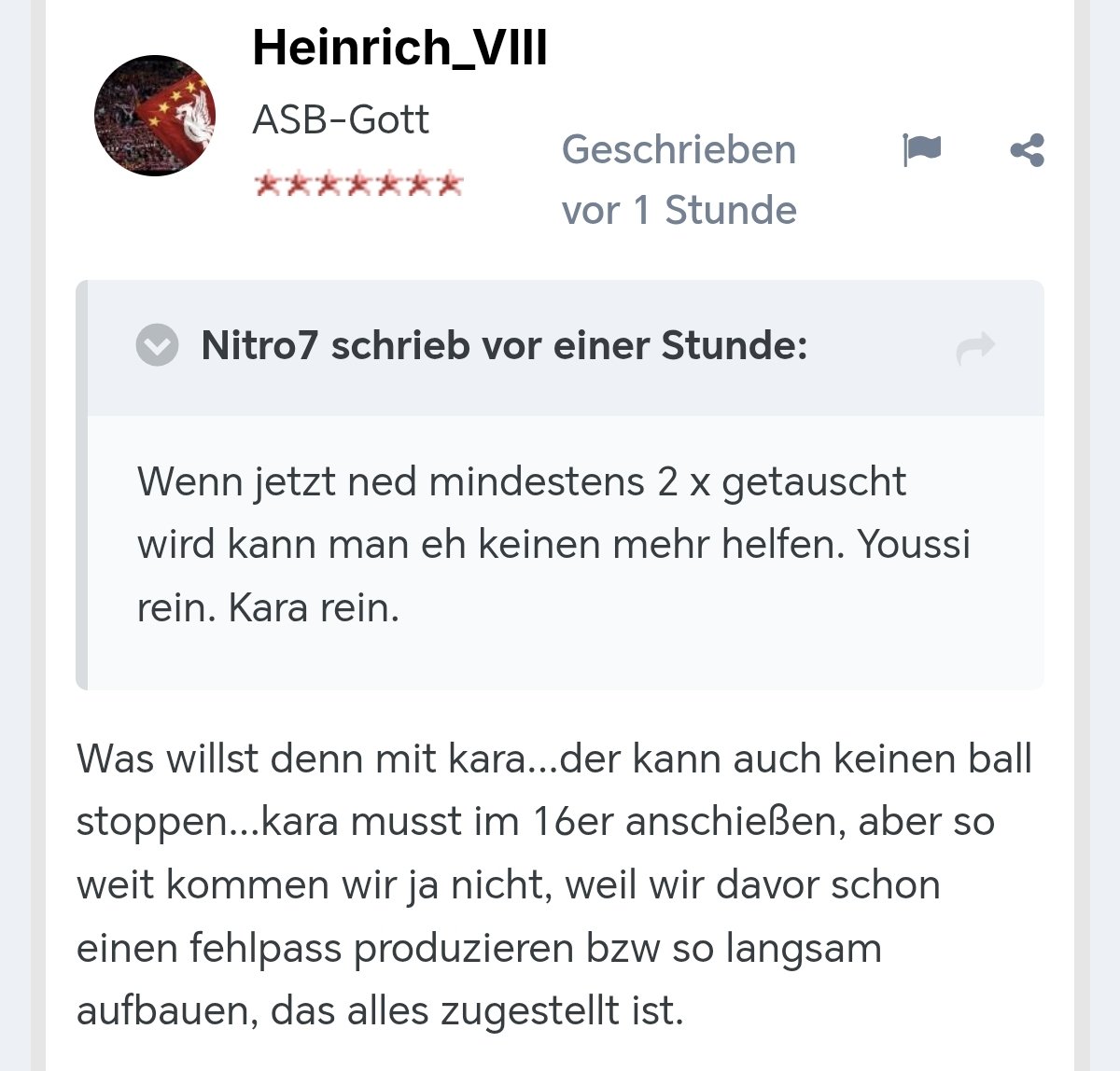 moerli V.I.P. Geschrieben vor 5 Stunden Hugo_Maradona schrieb vor 17 Minuten: Mit Antiste muss der Verein fertig sein. Das war ein skandalöser Auftritt. Dazu kommen dann noch die toxischen Elemente (Stichwort Elfmeter). So jemand darf unser Trikot nicht tragen Stimmt Auch der Schuß zum Ende muss er aufs Tor bringen aber er wollte es ja gar nicht Ranftl bitte Gusch, zu Hause auf Konter spielen aber ohne leichte Fehler von uns hättet ihr keine eigene Torchancen kreieren können Beide Mannschaften sehr schwach 0 Zitieren Diesen Beitrag teilen Link zum Beitrag Auf anderen Seiten teilen More sharing options...