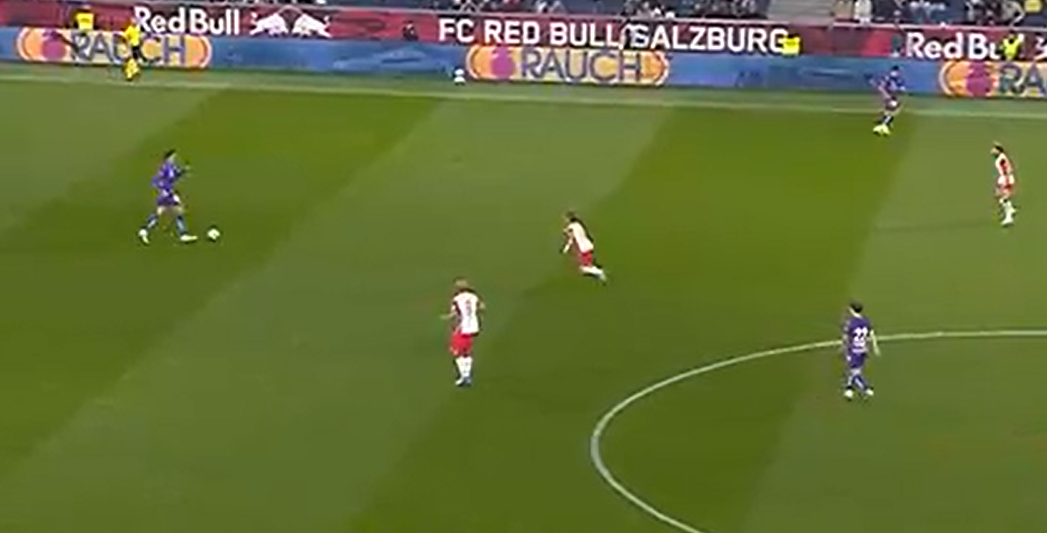 der rechnet entweder nicht damit oder is mit dem Kopf woanders weil anstatt, dass er den Ball nach rechts weitergibt schiebt er ihn wieder zu Plavo und in dessen Rücken. Von da weg muss der den Rückpass machen zu SSR. Aber die Frage sei schon erlaubt was man sich davon verspricht den Ball zurückzuspielen zu einem der gerade zu Verstehen gegeben hat, dass ihm die Situation mit den beiden RBS Spielern vor ihm zu heiss ist.