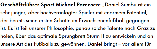 SturmUndDrang Postinho Geschrieben vor 1 Stunde Pepi_Gonzales schrieb vor 47 Minuten: Also ich glaube es war schon so gedacht, dass er die KM verstärkt. Wenn er mehr für die Amas gedacht ist dann okay. Ist im übrigen auch nix gegen ihn. Das Risiko hast natürlich in dem Alter. Aber dann hinterfrage ich mal was der Transfer bringen soll. Schaut halt wieder nach Panik-Parensen aus von außen. Schönaugürtel Mario schrieb vor 40 Minuten: Abgesehen davon dass es schon ein paar Spiele zur Eingewöhnung dauern kann, bleibt er eventuell über den Sommer oder ist für die 2er gedacht oder als Backup 5. Stürmer oder sonstwas. Einfach mal zu behaupten, dass sie den Spieler komplett falsch eingeschätzt haben und sich 6 Bundesliga Tore oder so erwartet haben, um Parensen kritisieren zu können, ist mir zu dumm. Der weiß schon welche Spieler er holt und was von denen zu erwarten ist. Problem ist hier eher wieder die Kommunikation. Könnte man ja eine Erwartungshaltung kommunizieren. Wislon wurde natürlich geholt um die KM zu verstärken. Bei den klassischen Zweitligatransfers gab es keine großen Posts dazu, und es wurde immer klar kommuniziert, dass der Spieler für die Zweier ist. Bei Sumbu hat MP das offen kommentiert: Plus wurde ja zwei Wochen vor Transferschluss eine "Verstärkung für die Offensive" bei Sky angekündigt. Dass Wilson jetzt, da er offebar die Erwartungen nicht erfüllt, für die Zweier geplant war, halte ich für ausgeschlossen. 0 Zitieren Diesen Beitrag teilen Link zum Beitrag Auf anderen Seiten teilen More sharing options...