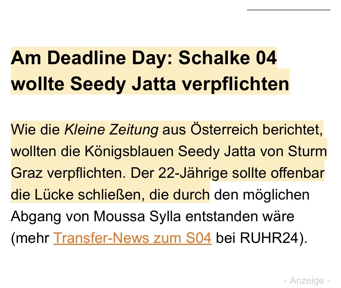 Dobinator Wahnsinniger Poster Geschrieben vor 2 Stunden pit1312 schrieb vor 33 Minuten: Schalke war nie konkret. Die haben so einen Typ wie ihn für Dzeko gesucht und sein Manager hat ihn halt ins Spiel gebracht Jatta disagrees: Zitat „Es hat wirklich nicht viel gefehlt“ SK Sturm: Seedy Jatta über Kritiker: „Warum soll ich für die noch kämpfen?“ 0 Zitieren Diesen Beitrag teilen Link zum Beitrag Auf anderen Seiten teilen More sharing options...
