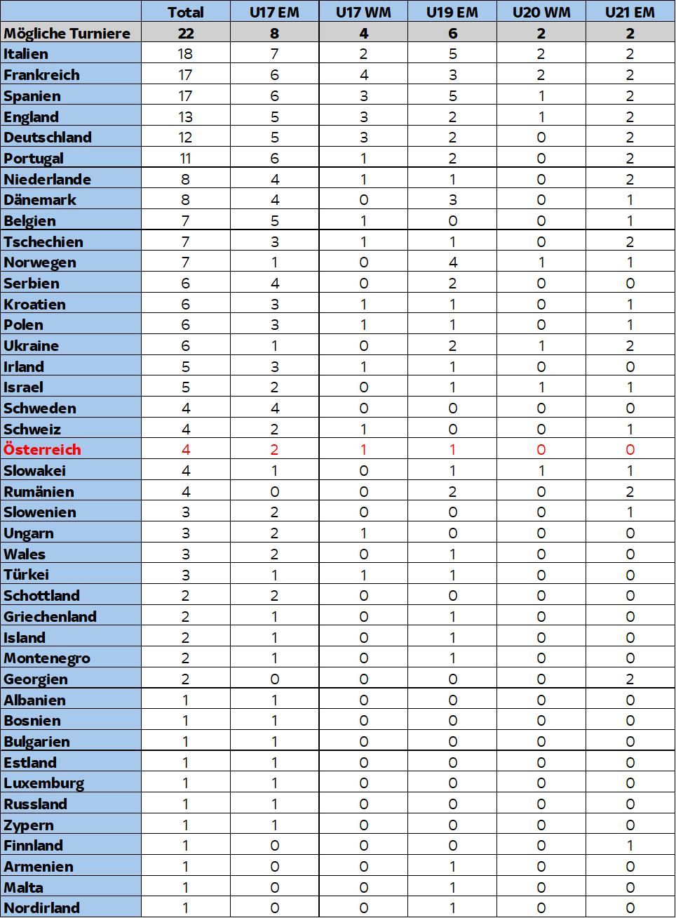 Vöslauer Prickelnd Geschrieben vor 2 Stunden Phil96 schrieb vor 9 Minuten: Die Bilanz unserer U-Nationalteams ist schon insgesamt sehr schwach, was Turnierqualifikationen angeht. Von den Jahrgängen seit 2000 hat man mit den gestrigen Ergebnissen von 25 möglichen Endrunden nur 4 erreicht (2002er & 2007er die U17-EM, 2003er die U19-EM & natürlich die 2008er die U17-WM) Die Frage ist, wie sich das im gesamteuropäischen Vergleich darstellt -> wie viele Nationen haben in deinem Bemessungszeitraum eine bessere Bilanz als wir, wo reihen wir uns da ein? Gerade was die EM-Qualifikationen betrifft, sprechen wir oftmals von nur sehr wenigen Qualifikationsplätzen, und die Quali-Turniere werden oft auswärts (sprich es gibt einen anderen Gastgeber) bestritten. Eine bessere Bilanz darf es natürlich sein, bei einer wesentlich besseren Bilanz hingegen könnten (oder müssten) wir dann behaupten, wir Österreicher wären bereits eine große Fußballnation. 0 Zitieren Diesen Beitrag teilen Link zum Beitrag Auf anderen Seiten teilen More sharing options...