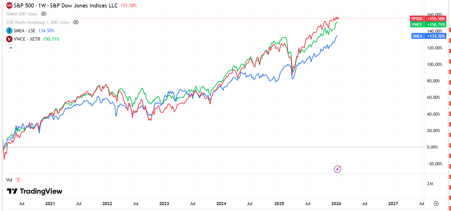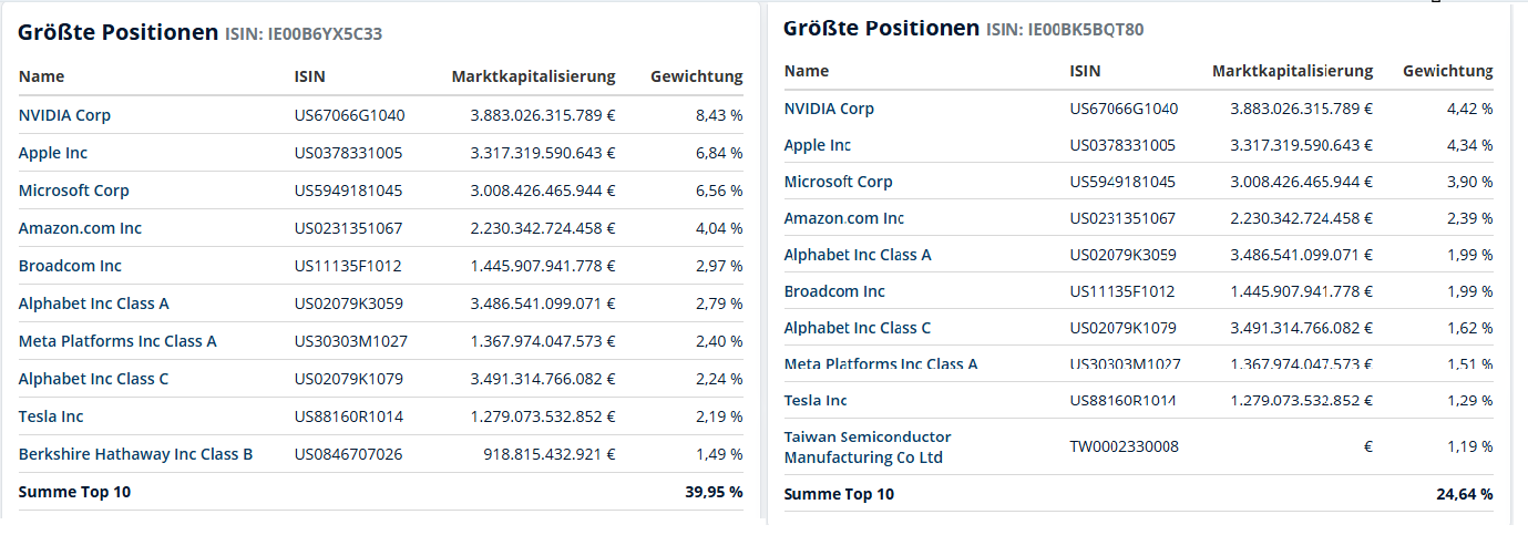 Oachkatzlschwoaf All hail groundhog supremacy! Geschrieben vor 2 Stunden Anonymer Thomas schrieb vor 4 Stunden: Ich interpretierte das mal so, dass man damit als Anfänger nicht viel falsch machen kann ? Wenn du langfristig anlegen willst machst du mit dem mMn nichts falsch. Es kann natürlich sein, dass er, warum auch immer, evtl. mal 30-50% abkackt, wenn Trump sich zB was lustiges einfallen lässt. Auf lange Sicht dürfte das aber kein Problem sein, und wenn sich der Kurs nicht mehr erholen sollte, haben wir wohl definitiv größere Probleme als den Aktienkurs Anonymer Thomas schrieb vor 4 Stunden: editedit und wenn ich zusätzlich S&P investieren würde wäre das "unnötig redundant" weil die eh im All world vorhanden sind oder? Außer ich setze verstärkt auf die Amis? Ja, es ist defintiv redundant. Links die Top10 Positionen des SP500, rechts jene des Vanguard All World Außer du glaubst halt die USA werden in den näcshten Jahren, oder eben langfristig, deutlich überperformen. Über die letzten 6 Jahre hinweg, also seit dem Covid-Reset, war das alles aber ziemlich ähnlich Vanguard All World (VWCE) und SP500 mit +150% und der iShares Core Europe ETF mit 135%. Zugleich muss man aber ergänzen, dass der Dollar in diesen Zeitraum 9% auf den Euro verloren hat (und seit dem Peak 2022 ganze 17%). Heißt, wenn du zu Beginn dieses Charts 1 mal Summe X investiert hättest, hättest du in der jeweiligen Währung der ETFs bei SP500 und VWCE mehr Gewinn, durch die Entwertung des Dollars bleiben von den 150% aber in Euro konvertiert nur mehr 125-130% übrig. Da hätte der Europa-ETF leicht mehr gebracht. Ich für meinen Teil habe letzhin jedenfalls einige US-Aktien verkauft und die Gewinne mitgenommen, gerade weil Trump sehr viel Porzellan zerschlagen und mMn den amerikanischen Markt langfristig geschädigt hat. Ansonsten sieht mein Grund-Portfolio sehr ähnlich aus wie das von Pironi Mit der Ausnahme, dass ich letzhin noch als "Wette" eine kleine Position des MSCI World ex USA hinzugefügt habe, der Anteil am Portfolio ist aber vernachlässigbar 1 Zitieren Diesen Beitrag teilen Link zum Beitrag Auf anderen Seiten teilen More sharing options...