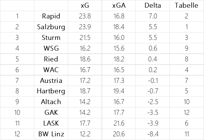 Ernesto Valdi am Weg ins Stadion Geschrieben vor 16 Stunden issoisso schrieb vor 14 Minuten: Hab mir mal die xG und xGA Werte der Liga angesehen. Paar interessante Dinge: bei uns ist es die 3. Saison wo wir massiv, aber wirklich massiv, bei den tatsächlichen Toren hinter dem xG Wert zurückhängen. 23/24: -10 Tore, Platz 10 in der "Effizienzwertung" 24/25: -11 Tore, Platz 12 25/26: -6 Tore, Platz 12 Also wir kreieren durchaus anständig sind aber ganz schwach im Abschluss. Es ist oft zwar eine bissl plumpe Reaktivforderung - der Knipser-Stürmer - aber bei uns scheint da wirklich was dran zu sein. Allerdings hatten wir ja einige verschiedene Stürmer-Typen in den 3 Jahren und auch der Rest vom Team strahlt wenig Torgefahr aus. Nichtsdestotrotz, dreht sich die Diskussion, wenn man sich die Zahlen ansieht, doch erstaunlich oft um den fehlenden 6er (eh bei mir auch). Wir lassen aber weder extrem viel zu, noch sind wir dann besonders schlecht im Abwehren der Abschlüsse. Das genau Gegenteil von uns ist btw. Sturm mit +11 Toren 23/24 und +8 Toren 24/25. Also stark überdurchschnittlich effizient. Heuer bisher auch noch nicht (aber dass die Qualität im Angriff verloren haben, das war abzusehen). Beeindruckend find ich auch wie Kühbauer die schlechteste Defensive der Liga zu 5 Siegen ohne Gegentor (inkl. Cupspiel) gecoacht hat. Dramatische Verbesserung. All in all sind wir aber spielerisch über die Saison gesehen immer noch gut dabei - oder was heißt gut - führend. Das hat mich fast bissl überrascht. das ist alles nur glück, denn bei uns gibt es keine "basics" und kein system. 1 Zitieren Diesen Beitrag teilen Link zum Beitrag Auf anderen Seiten teilen More sharing options...