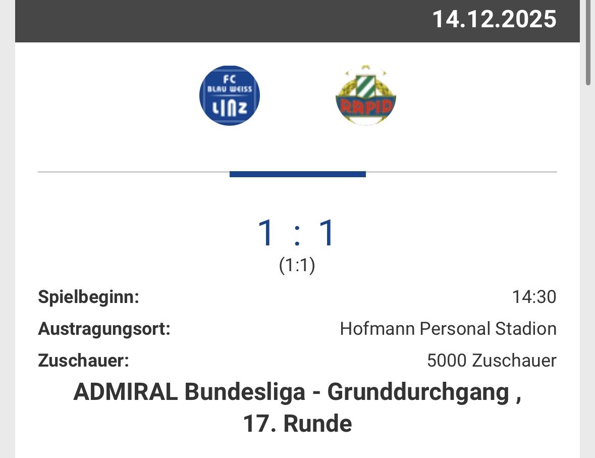 Sturm damit wohl ab morgen ohne säumel. Ein Gemetzel wird das um die ersten 6, jetzt ist die Austria auch wieder voll dabei. Und damit überwintert rapid außerhalb der ersten 6, frohe Weihnachten nach hütteldorf 🤭. Im August schon Meister, haben halt vergessen dazu zu sagen, Meister im UPO.