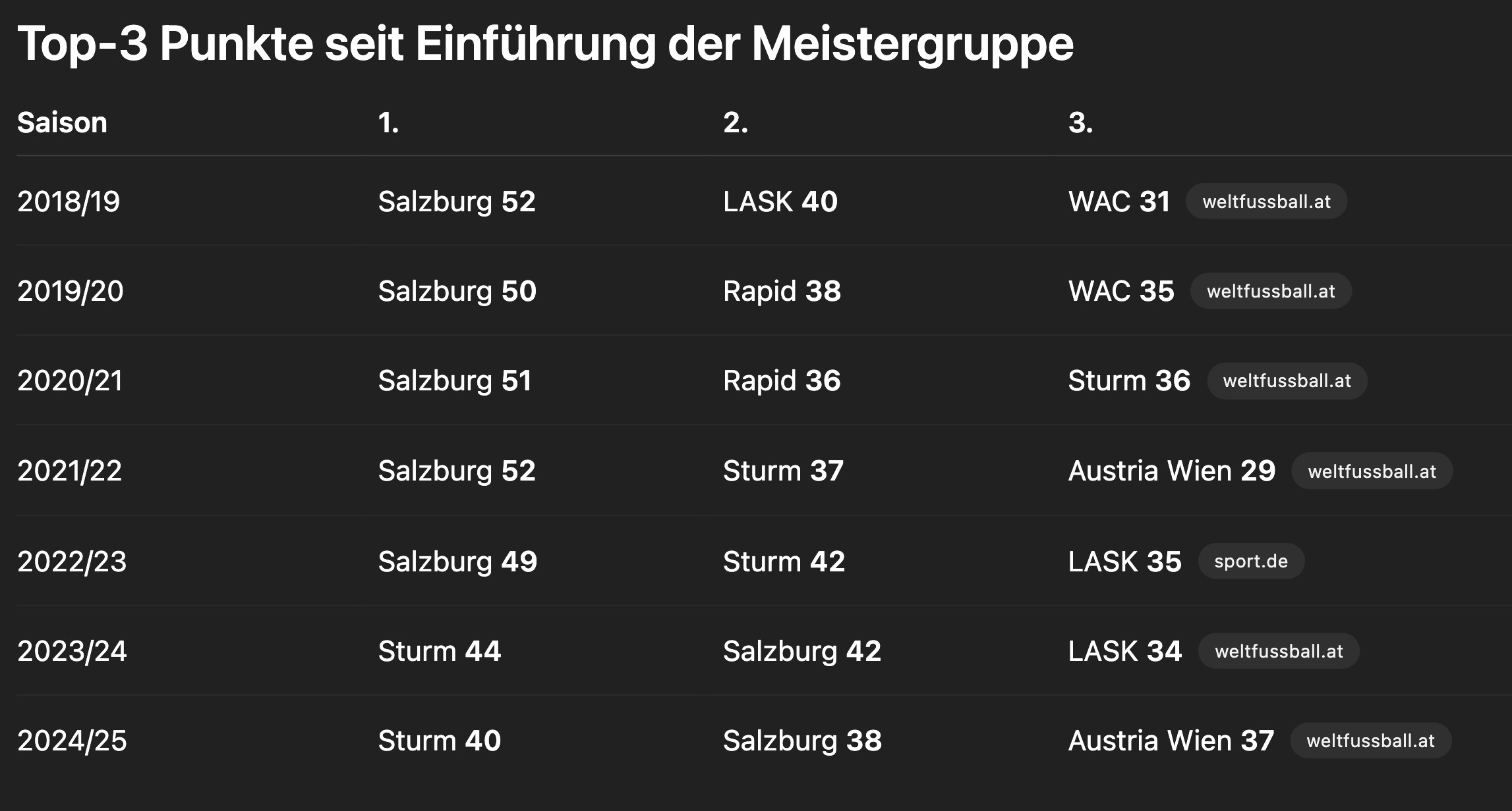 systemoverload Kennt das ASB in und auswendig Geschrieben 24. August (bearbeitet) elmod schrieb vor 10 Stunden: Na ja, unser aktueller Trainer hatte in der letzten Runde der Vorsaison noch die Chance Meister zu werden. Wie oft war das in den letzten Jahren der Fall? Ich finde dass das gar nicht einmal so lächerlich war. eh. aber in der Vorsaison war so wirklich niemand meisterlich unterwegs. Bleibt Ilzer bei Sturm holen die ohne Probleme den Titel. Wir hatten 4 Siege, 4 niederlagen, 2 unentschieden im oberen playoff. Wovon der Sieg gegen BW eine Unleistung war so wie ein Sieg gegen sturm unglaubliches Spielglück. So wie Schmid damals das Glück hatte mit 29 Punkten dritter zu werden, spielst mit unserer Performance im Normalfall nicht um den Meister mit. Es ist und bleibt aber eine gute Saison und man hat das von den Ergebnissen das erreicht, was man vorhatte, finde ich. Mit etwas weniger Glück machst aber nicht mal die 37 Punkte. Will man nächstes Jahr international spielen wird es wohl wieder so eine Ausbeute brauchen wie in der Vorsaison. Edit: Liga Performance von Rapid die letzten Jahre eigentlich sehr mies bearbeitet 24. August von systemoverload 1 Zitieren Diesen Beitrag teilen Link zum Beitrag Auf anderen Seiten teilen More sharing options...