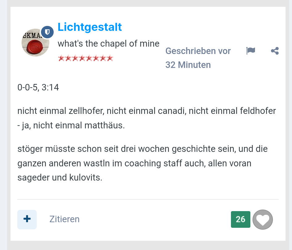 memphis86 Top-Schriftsteller Geschrieben vor 2 Stunden AlBen21 schrieb vor einer Stunde: War scho ok wieder sagt Hr Stöger Der Trojaner erfüllt seinen Job, passt schon. In Ried gönn ich ihnen eine Punkt, nicht dass Katzer auf dumme Gedanken kommt... 0 Zitieren Diesen Beitrag teilen Link zum Beitrag Auf anderen Seiten teilen More sharing options...