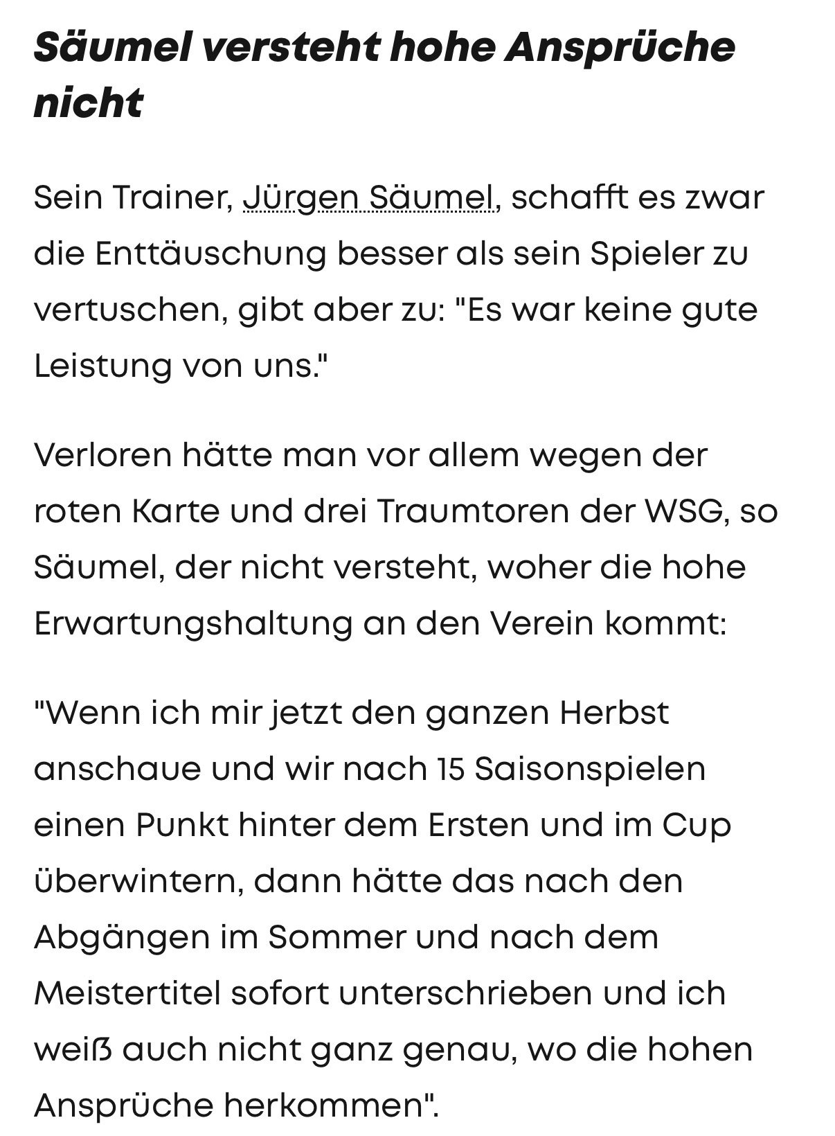 systemoverload Postinho Geschrieben vor 32 Minuten AustriaWien1997 schrieb vor 8 Stunden: Ohne das Match heute gesehen zu haben brauchen wir jetzt auch nicht so zu tun als ob wir gegen Real Madrid ein heroisches 0:0 erkämpft haben. Unser auftritt am Samstag war einfach unter aller Sau auch wenn die WSG gerade gut drauf ist ist 1 Torschuss in 90 Minuten einfach absolut inakzeptabel und sollte/muss zu denken geben. Sturm ist halt auch richtig schlecht gerade (die wsg aber sicher auch gut in Form) bzw. nicht stabil. stankovic, kiteshvili usw kaschieren da noch viel und der Säumel nicht ausreichend, allein nach so Aussagen musst ihn kündigen: 6 Niederlagen in 15 Spiele ist halt nicht gut, und der redet was davon, dass er die Ansprüche nicht versteht. Die haben um knapp 7 Mille Spieler verpflichtet und ein paar gute Leihspieler noch dazu. Extrem gute Mischung im Kader, paar Ankerspieler und viele talentierte Spieler die noch sehr jung sind. 0 Zitieren Diesen Beitrag teilen Link zum Beitrag Auf anderen Seiten teilen More sharing options...