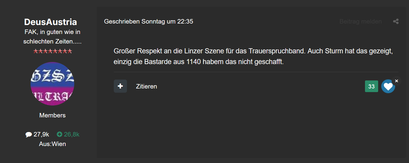 SandkastenRambo ASB-Legende Geschrieben vor 1 Stunde Pinkman schrieb vor 5 Stunden: Ein Todesschicksal hernehmen, um Hass schüren zu können. Richtig dummer Mensch, beweist er aber eh des öfteren DeusAustria schrieb am 1.3.2026 um 22:35 : Großer Respekt an die Linzer Szene für das Trauerspruchband. Auch Sturm hat das gezeigt, einzig die Bastarde aus 1140 habem das nicht geschafft. 31 Likes dafür 0 Zitieren Diesen Beitrag teilen Link zum Beitrag Auf anderen Seiten teilen More sharing options...