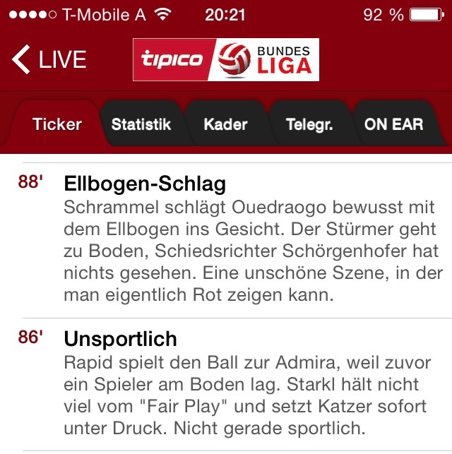 wobei man ja net vergessen darf ,das hinteregger ja gar nix gemacht hat,und dann wegen Unsportlichkeit im nachhinein vom Strasenat rot bekommen hat-was aber normalerweise nur mit gelb bestraft werden darf