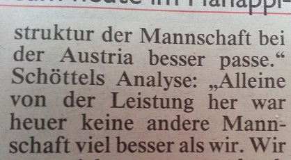 kingpacco V.I.P. Geschrieben 16. März 2013 In der Krone steht es doch um eine Spur anders : Schöttels Analyse: Alleine von der leistung her,war heuer keine andere Mannschaft viel besser als wir. Also klingt das schon wieder anders als oben beschrieben. heuer heisst 2013 und eben auch das die Gegner net um soviel besser waren als Rapid-und damit hat er recht-oder spielen die neustädter jetzt besser Fussball als die grünen ,rein von der Optik her? 0 Zitieren Diesen Beitrag teilen Link zum Beitrag Auf anderen Seiten teilen More sharing options...