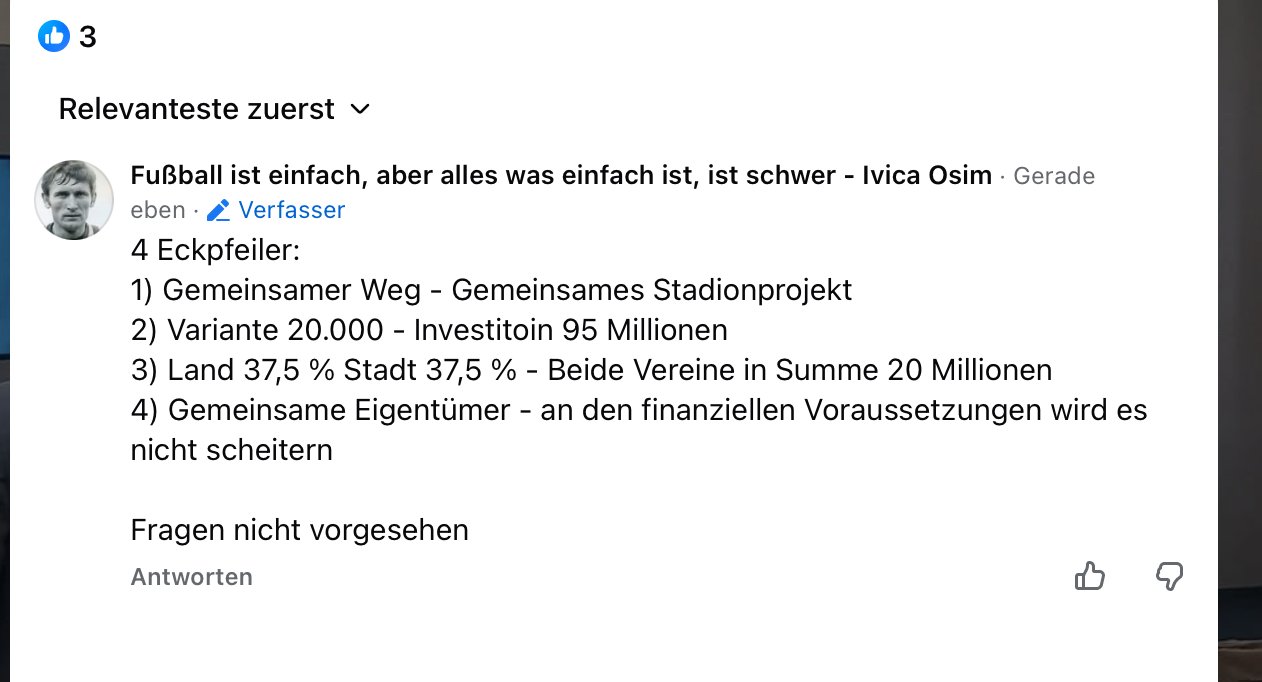 soulbro82 Postinho Geschrieben vor 17 Stunden SchwoazaSteira92 schrieb vor 3 Minuten: Also 20 000 statt 25 000. Dann hast im Grunde e nur eine Sanierung (neue Sessel) und Graben überbauen und vl das Sporttagungszentrum von 2018 und ein paar Skyboxen. 95 Mio. für den erwartbaren Schwachsinn auszugeben ist mMn nach fahrlässig. 8 Zitieren Diesen Beitrag teilen Link zum Beitrag Auf anderen Seiten teilen More sharing options...