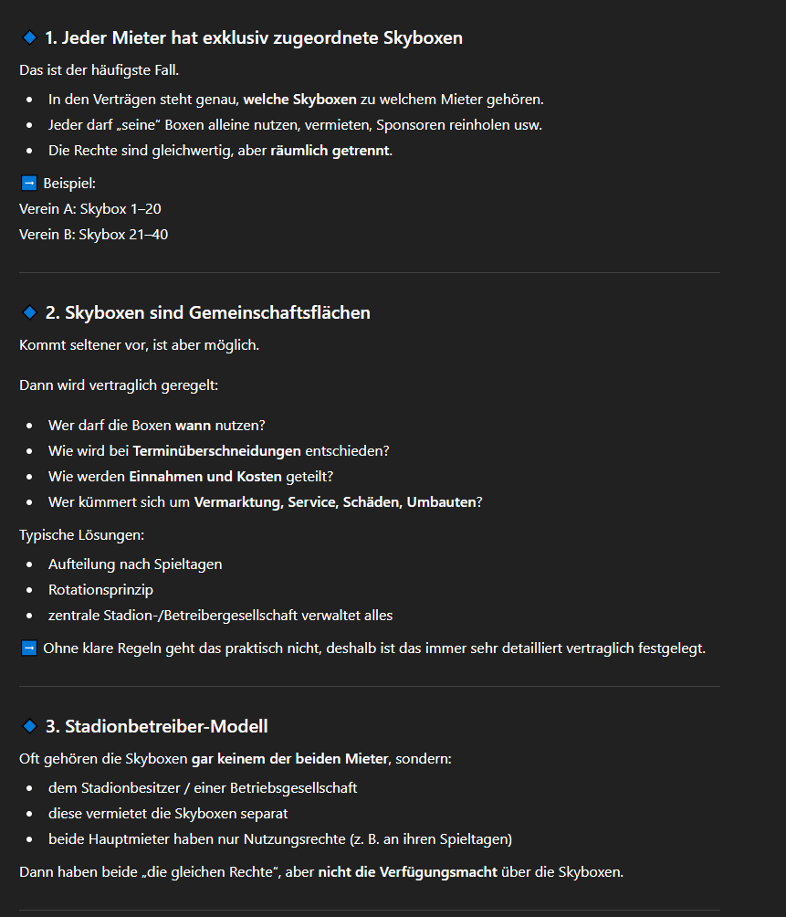 RasmusHojlund Im ASB-Olymp Geschrieben vor 3 Stunden Laptoptrainer schrieb vor 2 Minuten: Wie werden eigentlich die Skyboxen in einem geteilten Stadion vermietet? Hat man dann nur Zugang bei Heimspielen des vermarkenden Vereins? Oder wird das dann allgemein vermietet und die Vereine teilen sich die Erlöse? Weiß da jemand, wie das in anderen Stadien gelöst wird? Punkt 1 wäre typisch, dann machens zB eh nur 6 neue Skyboxen und dann bekommt jeder Verein nur 3 0 Zitieren Diesen Beitrag teilen Link zum Beitrag Auf anderen Seiten teilen More sharing options...