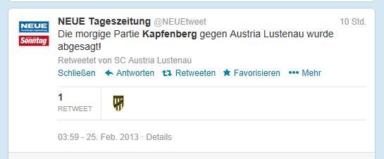 StopGlazer ***** Geschrieben 25. Februar 2013 Woher kommt das? Meine letzte Info war, dass der Platz in Kapfenberg zumindest vorläufig für OK befunden wurde: http://www.facebook....horn.at?fref=ts habe ich von einem austria lustenau-tweet, die wiederum einen (falsch)tweet der nvt weiter verbreitete (daher auch der unfug kapfenberg würde gegen austria lustenau spielen): 0 Zitieren Diesen Beitrag teilen Link zum Beitrag Auf anderen Seiten teilen More sharing options...